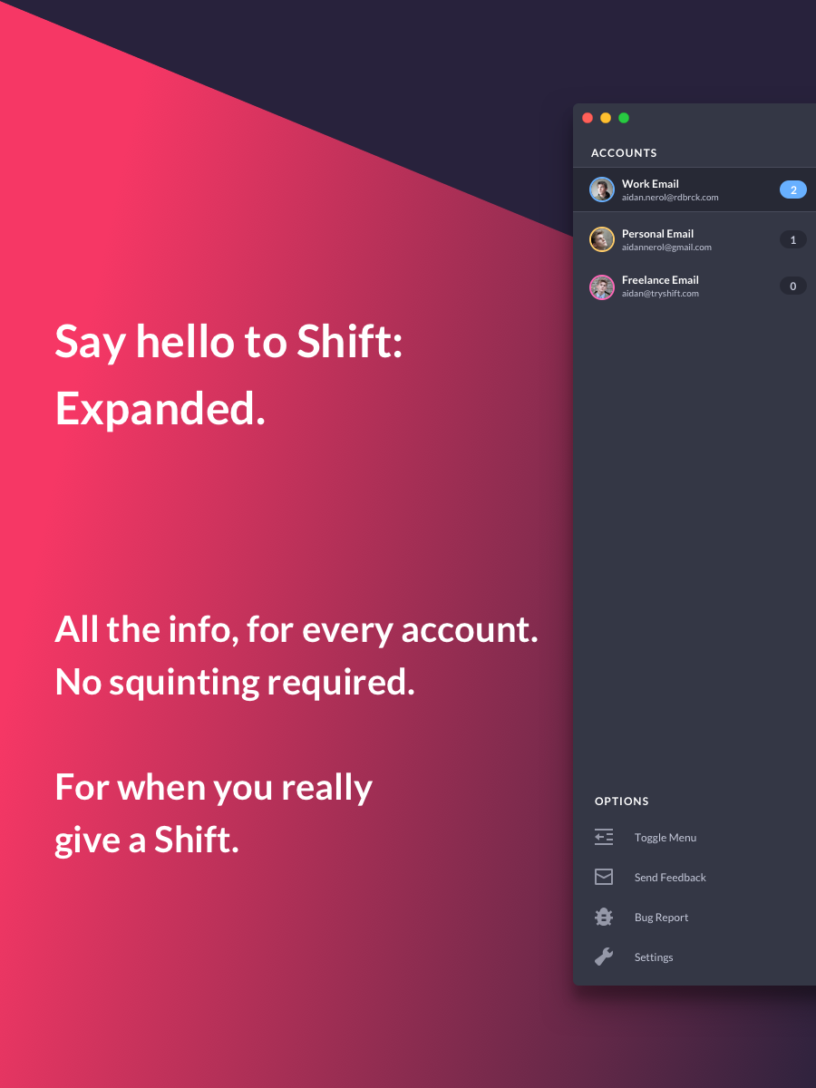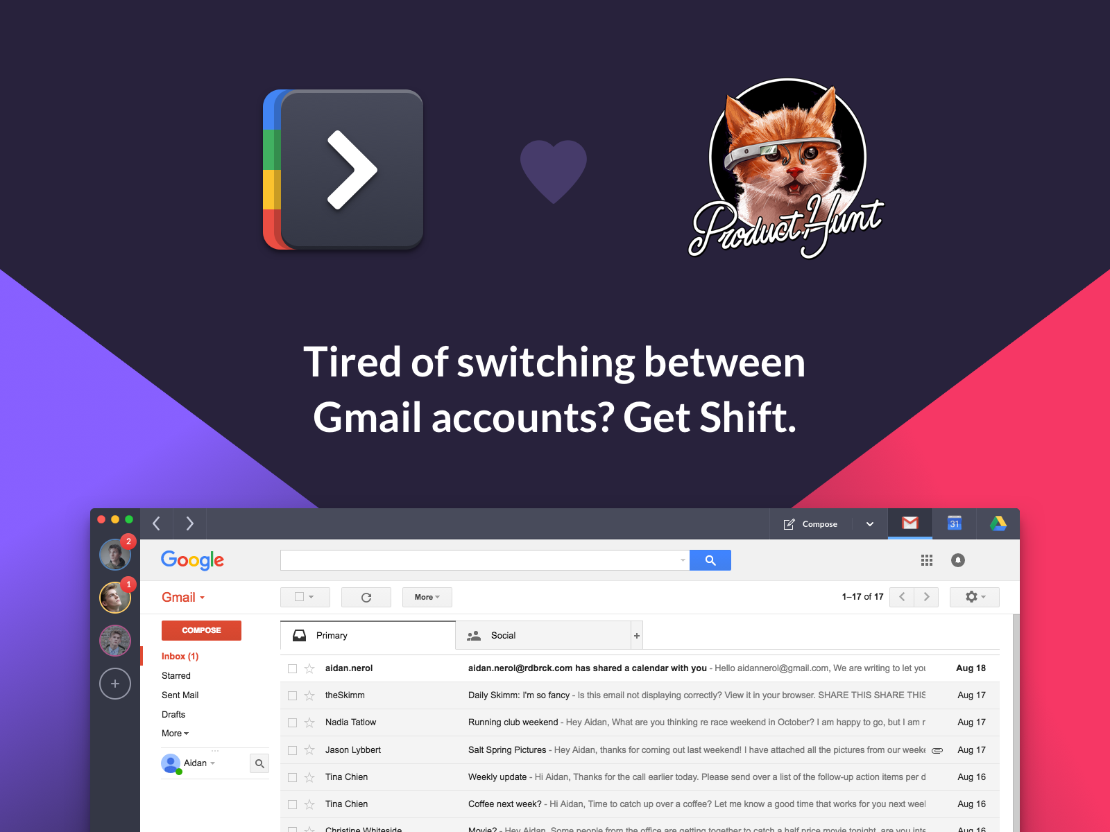 Hello Product Hunters, and thank you @awilkinson for hunting Shift! We built Shift with people who rely on multiple Gmail accounts and G-Suite apps like Docs, Drive and Calendar - for both personal and business purposes - in mind. In particular, those that love the Gmail web interface! One of the biggest pain points they face is constantly needing to toggl… See more