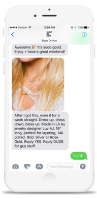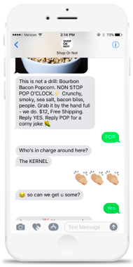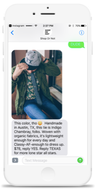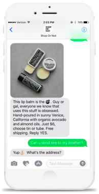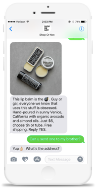 "SMS exclusive. We text you 1 awesome thing, just once a week, you reply 'Yes' to buy it. Curated for you, all made in America, all starts under $20. Coffee pods roasted in Bozeman, Montana, bourbon cherries from Charleston, men's soap distilled in Maine, jewelry from Austin, 200+ micro brands in food, fashion, skincare and coff… See more
