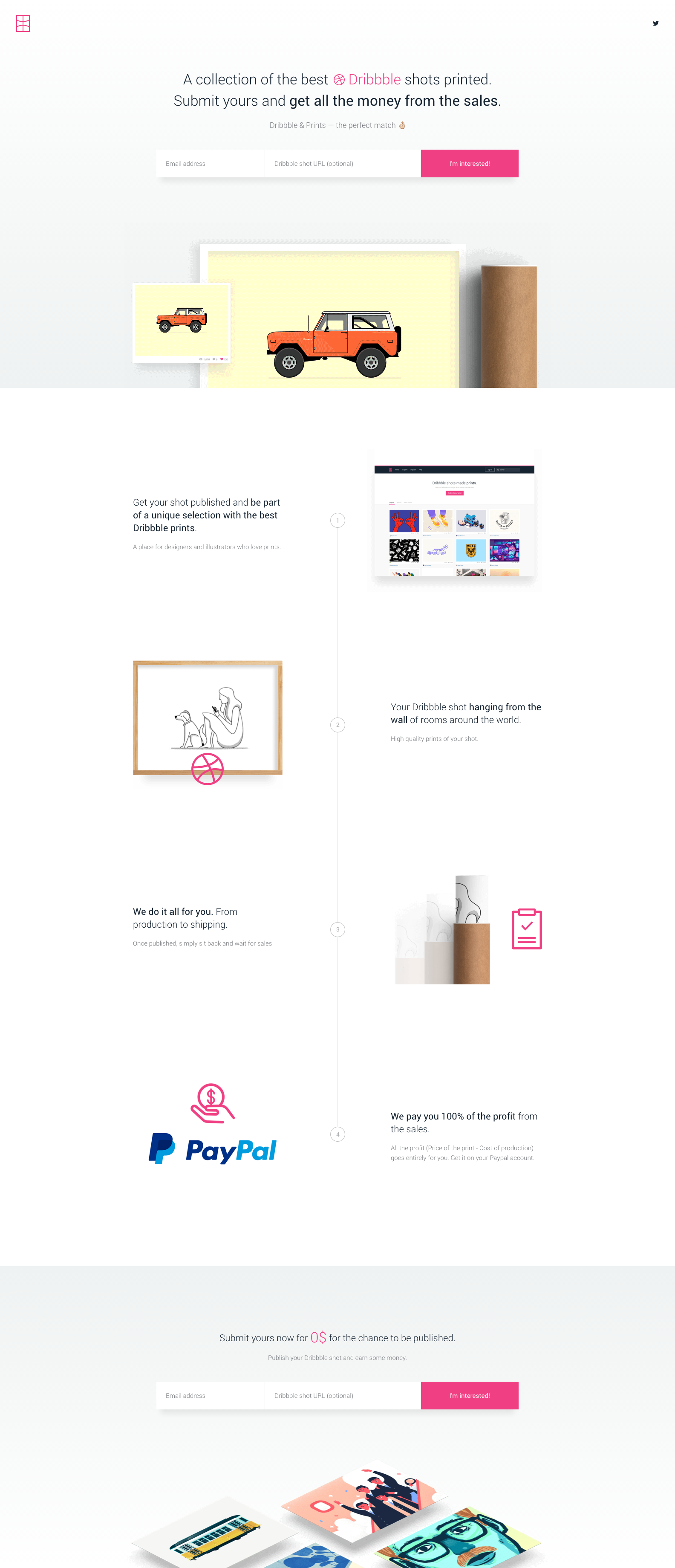"Shot Prints" is a collection of the best Dribbble shots printed. It enables its users to submit their best Dribbble shot to be sold as a print and keep all the money from the sales.