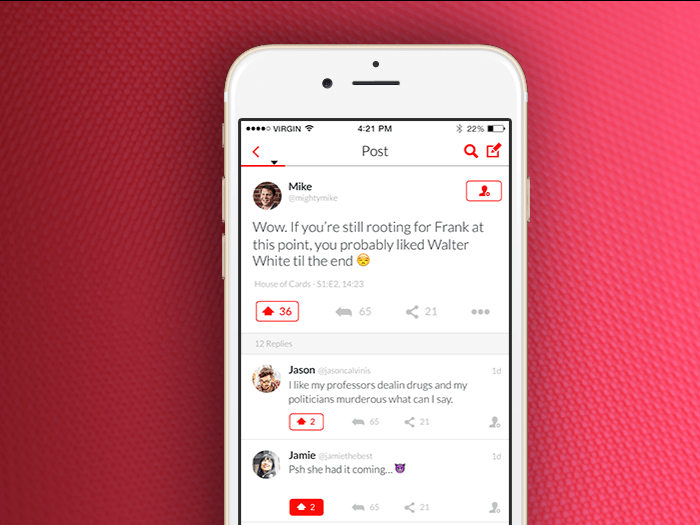 I think you'll get a kick out of Showgo while watching the House of Cards Season 4 premiere this Friday. Showgo lets you read and post comments at your exact moment in Netflix & Hulu shows. Tap to sync and the app immediately identifies the exact point in the timeline of the episode you're watching. From there you can see how other fans are rea… See more