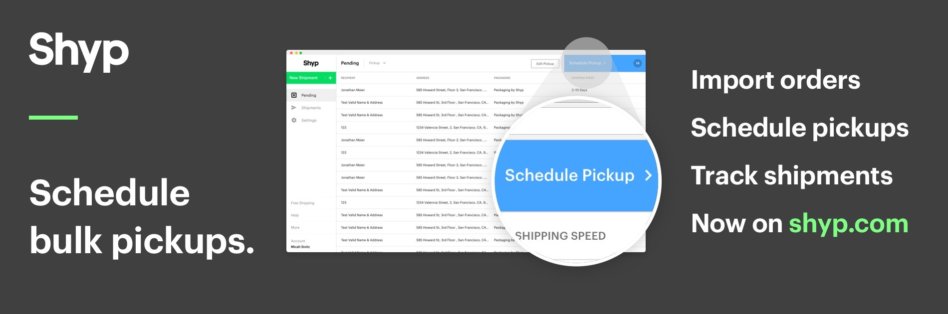 As some of you might remember, we launched a Web Dashboard in the fall allowing customers to price compare services and purchase shipping labels. Starting today, we’re adding the ability for Shyp customers in NYC, LA, Chicago, and San Francisco to bulk import orders (through CSV, Shopify or eBay) and schedule pickups for their shipments from the w… See more