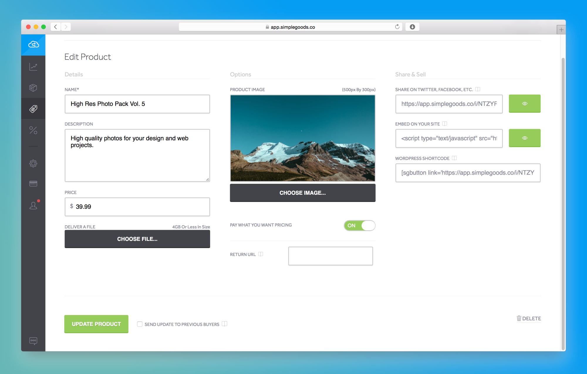 Think Gumroad without all the weight of the features you don't use. Perfect for selling Ebooks, videos, icons, podcasts, PSD's, MP3's etc...