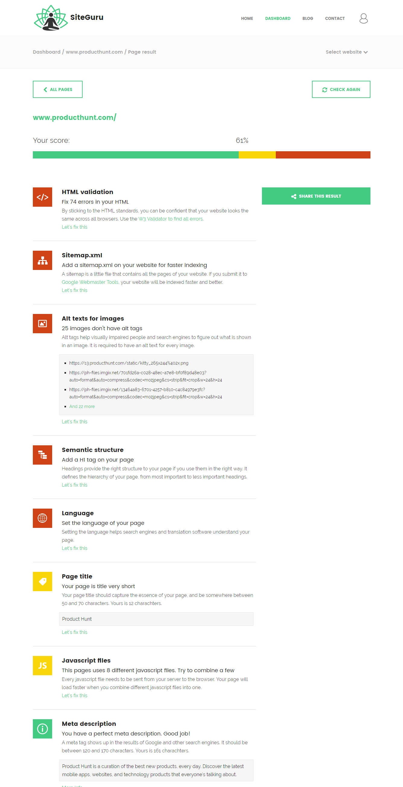 Siteguru.co lets you run a free website check. Analyze your website for SEO improvements and usability issues like meta tags, speed, security and duplicate content.