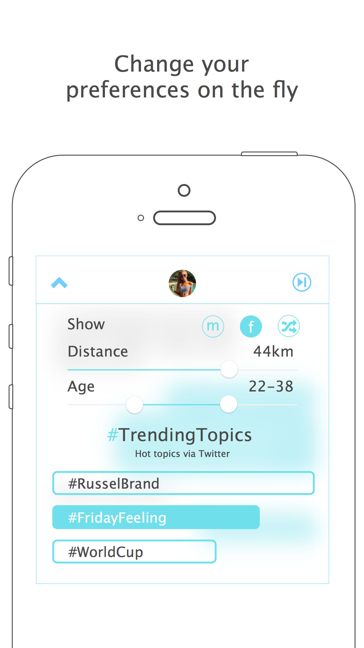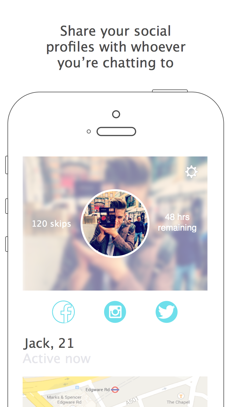 Skipchat pulls in the top trending topics directly from Twitter and matches you with someone nearby that wants to talk about the same thing! (There's also a few nifty tricks in there like the ability to share your social accounts with matches plus m… See more