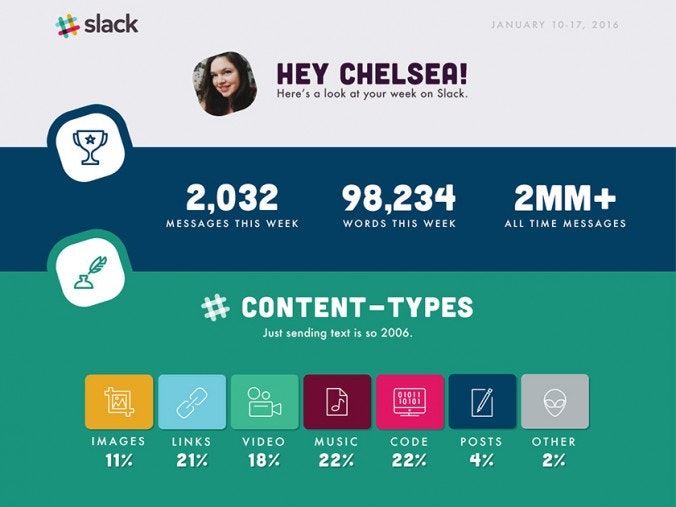 A fun report that lets you find out what types of content are shared most frequently on your Slack channels and whom you talk to the most. Get very stats like which words are misspelled and which swear words are used more often, and which emojis get the most use.