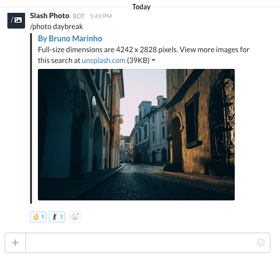 This is an elegant implementation of @unsplash's API for Slack - simply type /photo [keyword] and you end up with a great visual. The content from Unsplash is quite good (we're incorporating a lot of it in @wandertab as well) and I'm a big fan of the creator, @calc !