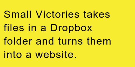 Small Victories takes files in a Dropbox folder and turns them into a website. There are pre-defined themes like Document (perfect for API docs), Slideshow (for sharing holiday pics) or Ecommerce (for selling stuff); or use it to easily host static HTML sites. It's pretty neat, no fuss site development that makes your content instantly look good. Love how si… See more