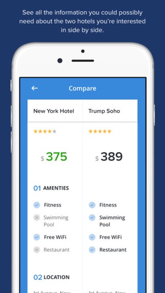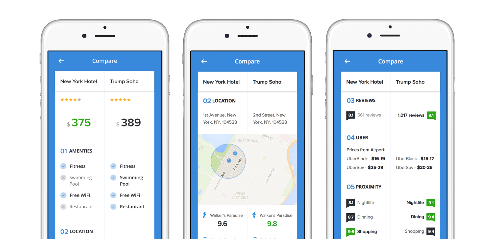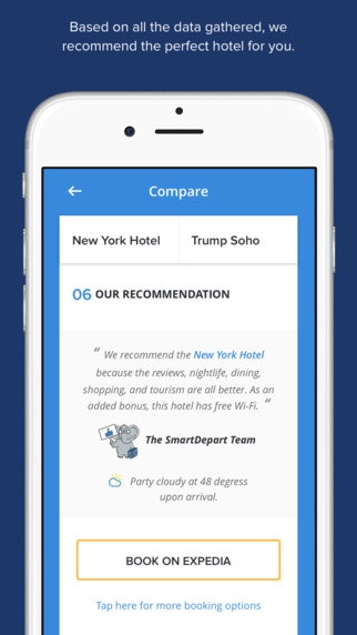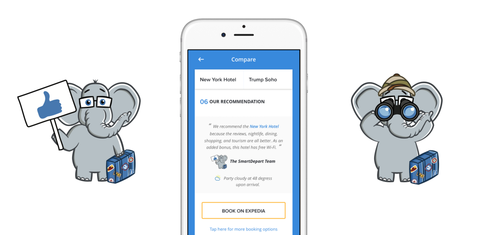 SmartDepart allows you to compare two hotels side by side– and not just by price. You get to compare walk scores, amenities, Uber prices from the airport, nightlife, food options with Yelp reviews and more.
