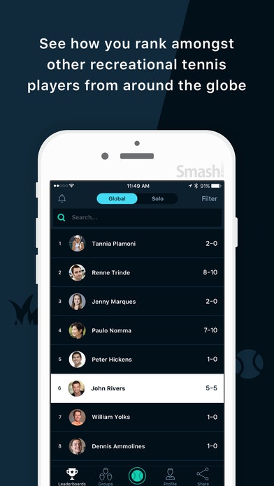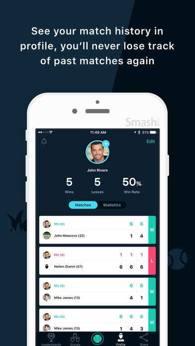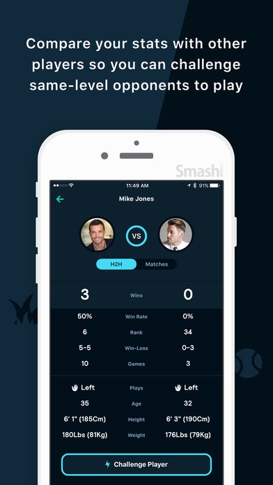 Smash Tennis is a mobile tennis app that helps players find local hitting partners, track match scores, and compete for rankings. Featuring a comprehensive player-search by age, skill level, and distance, tennis players will be able to find local hitting partners with ease, challenge them to matches, and quickly get on the courts.