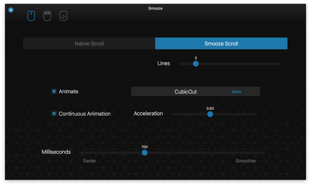 Smooze animates your scroll and adds functionality to your non-Apple mouse (scroll-wheel mouse).
