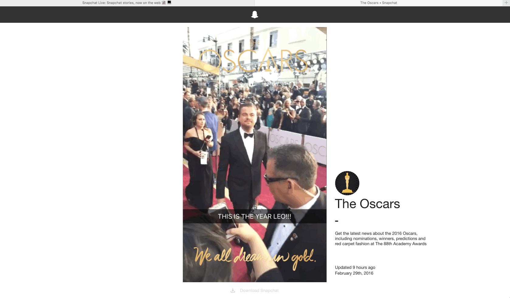 Last night Snapchat rolled out a web version of Snapchat... sort of. You can watch the Oscars story right now at snapchat.com/live. I'd expect to see other event-based stories make their way to the web as Snapchat has already become a destination for news and entertainment for so many. We web-based experience seems inevitable, even though it changes the i… See more