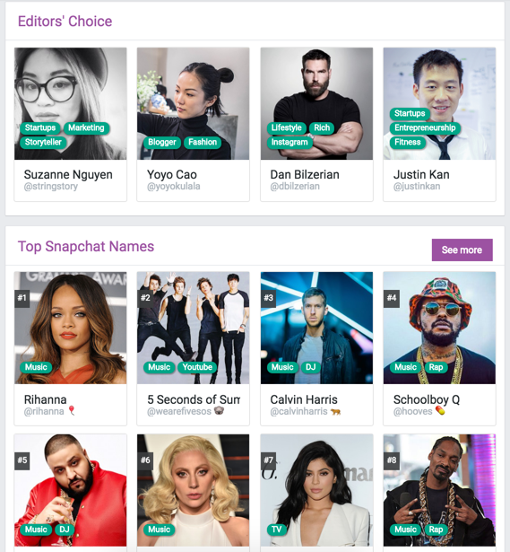 Snapchat is full of interesting people who produce unique content exclusively to Snapchat (Justin Kan, Mark Suster to name a few). I wanted to find more people like them, but there's nothing really good out there to help you discover new Snapchat accounts… See more