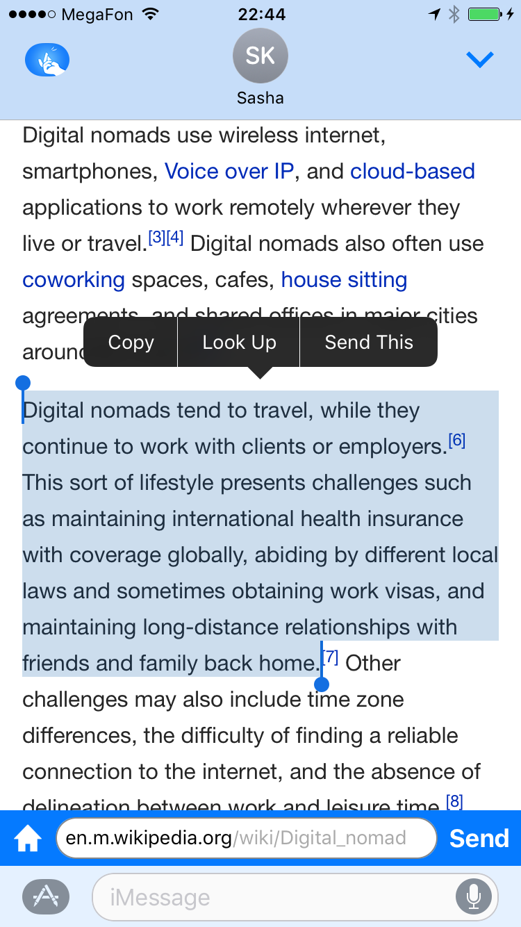 Snappy is a browser living in your iMessage app, allowing you to quickly send links and quotes from pages without switching to Safari app. It syncs history via iCloud and offers search suggestions. You can select some text in Snappy and tap "Send This" which, well, would send it as a quote.