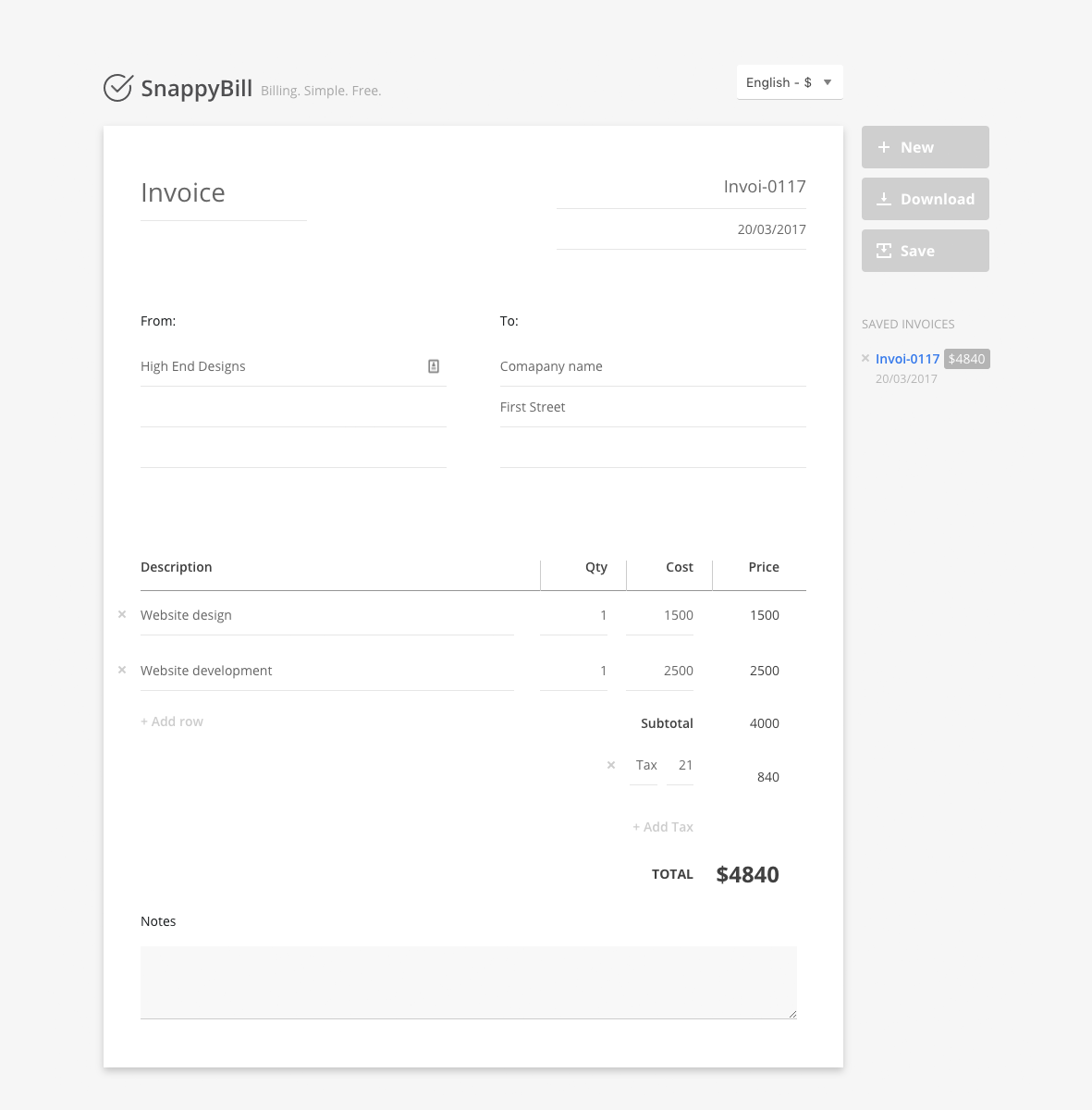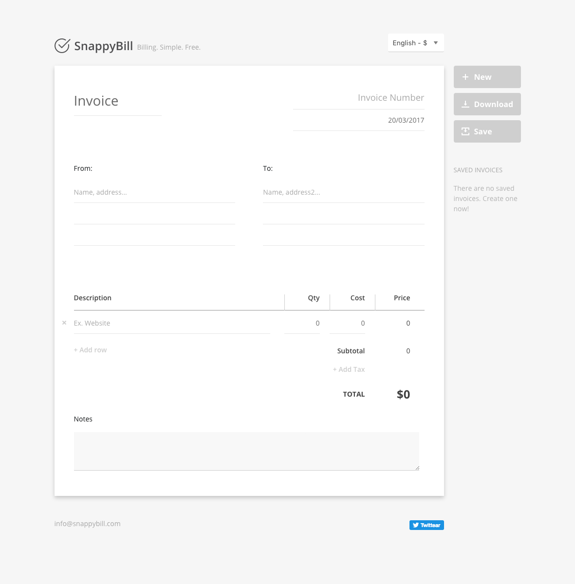 Online invoice generator. Create and download or save it for later. All with no sign-up or login.