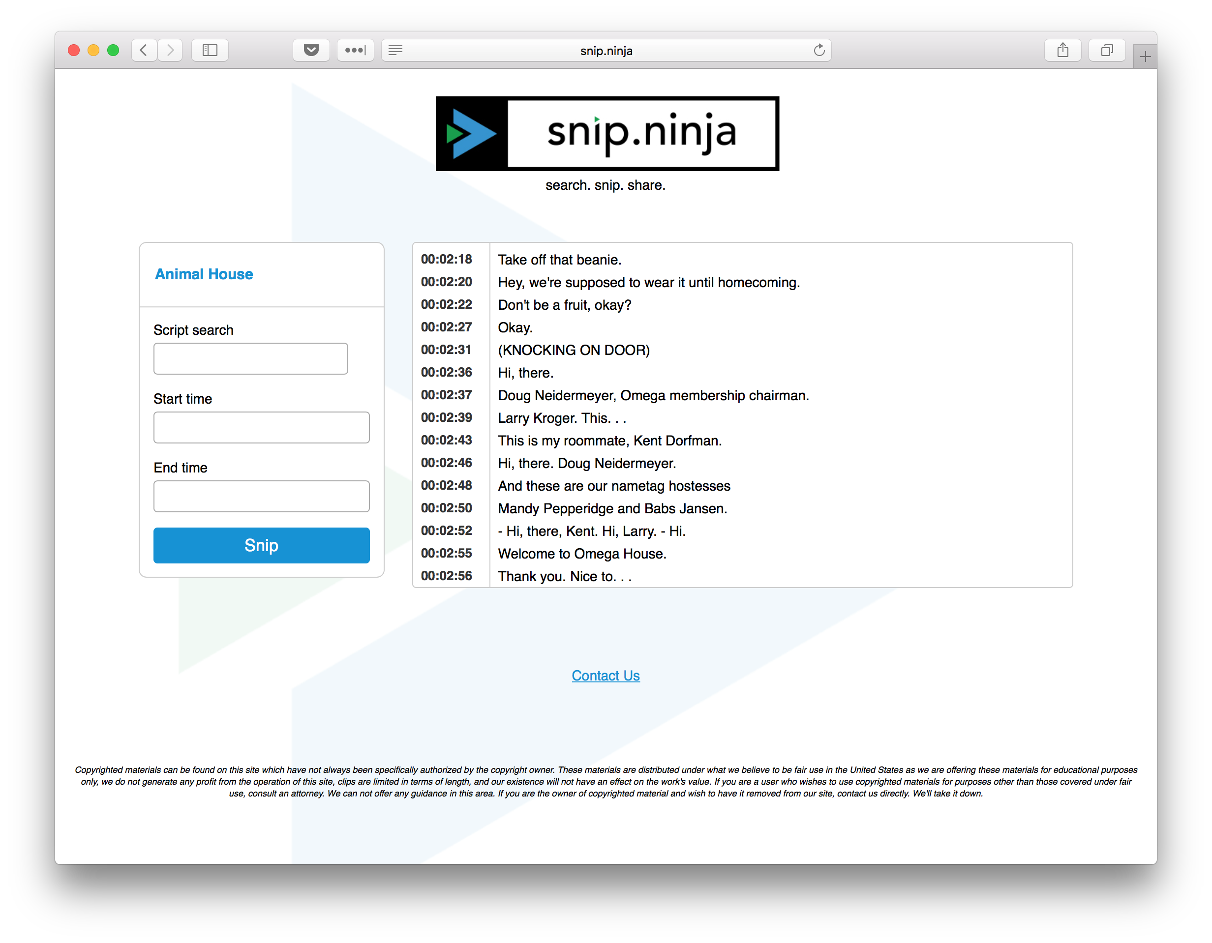 As a movie fan, I love that you can really easily make a snippet from any movie just by searching the script for that one phrase you're looking for. No more scouring google image search to find that perfect gif!