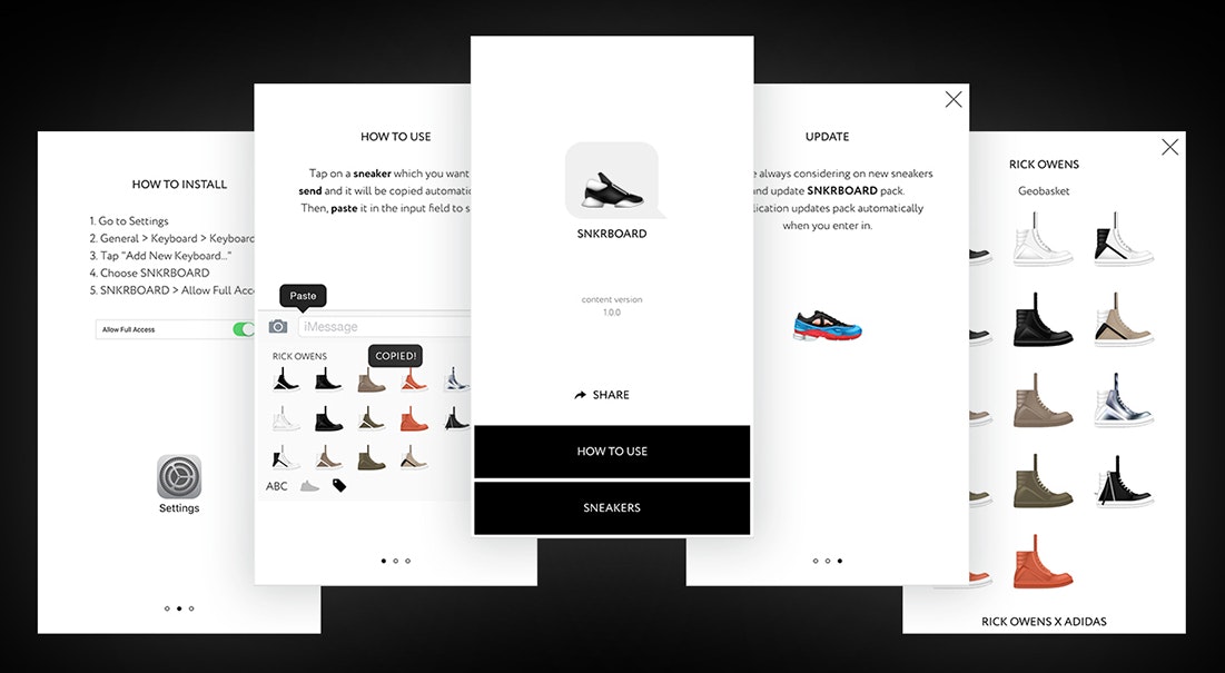 Application contains external keyboard with well structured models of sneakers in emoji representation.