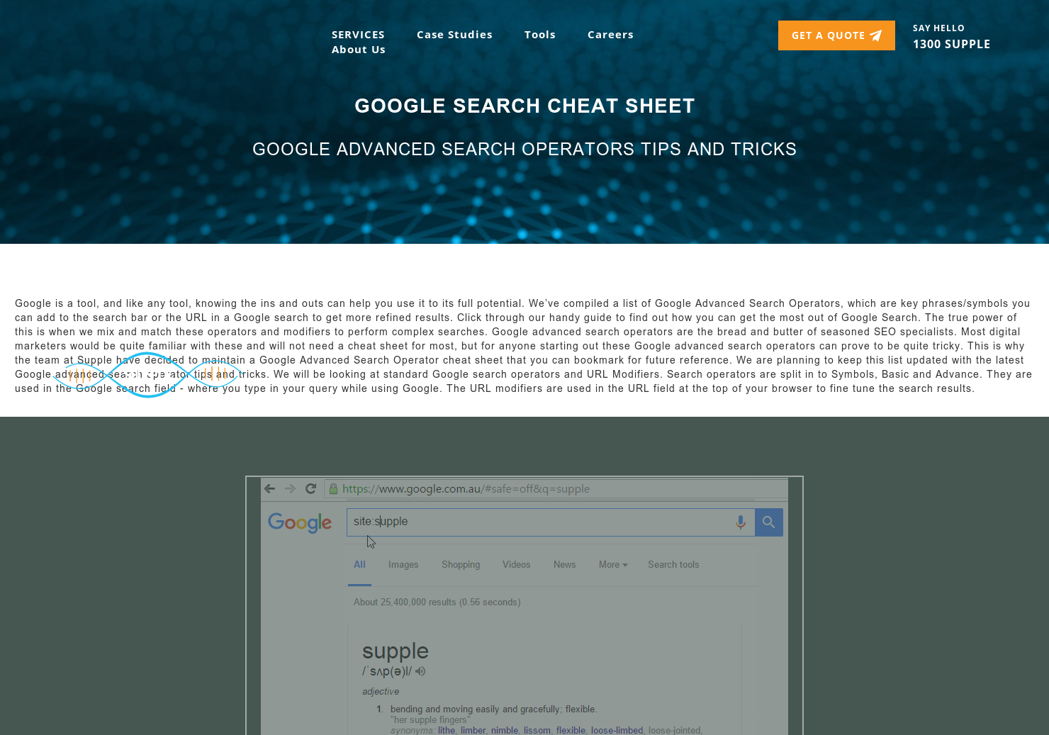 Google is a tool, and like any tool, knowing the ins and outs can help you use it to its full potential. We’ve compiled a list of Google Advanced Search Operators, which are key phrases/symbols you can add to the search bar or the URL in a Google search to get more refined results. Here is a gif showing one in action : https://supple.com.au/tools/goog...