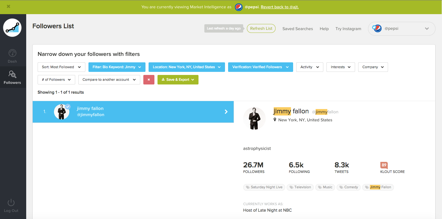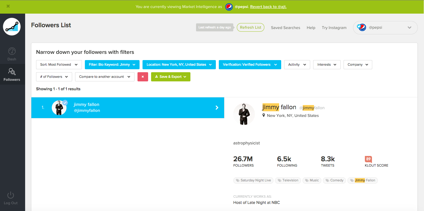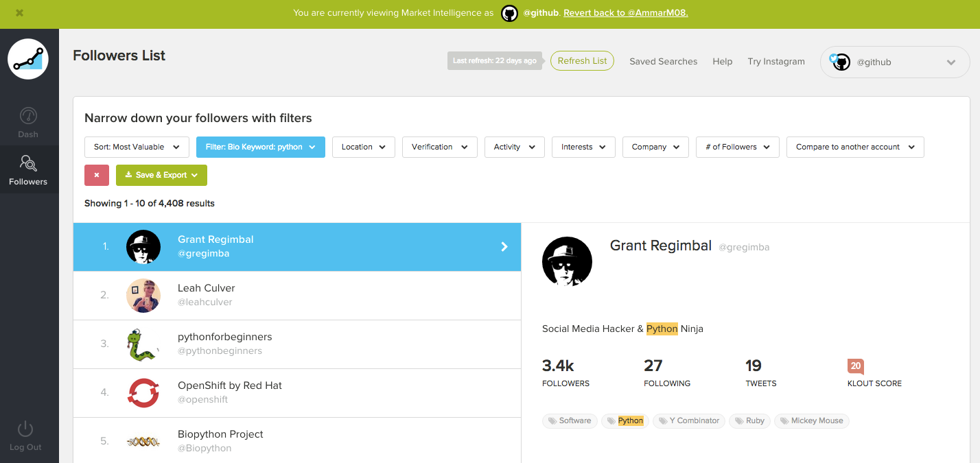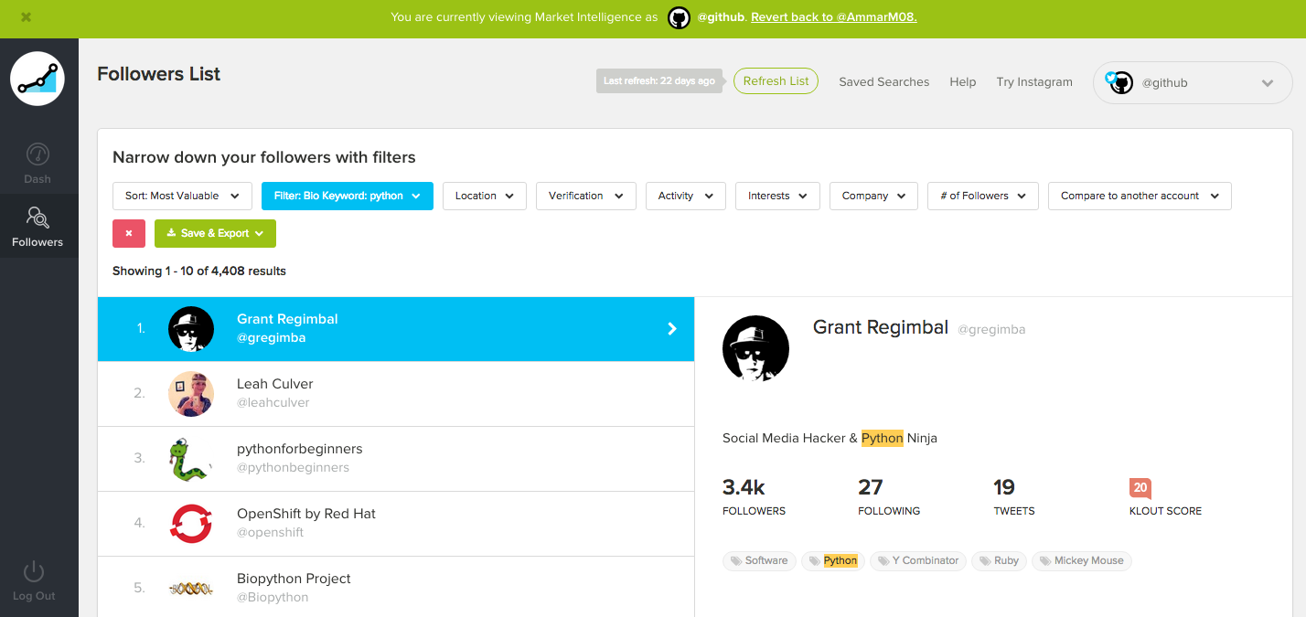 Market Intel is everything SocialRank already does, organizing your Twitter followers and allowing you to filter them by location, interests, engagement, and influence.