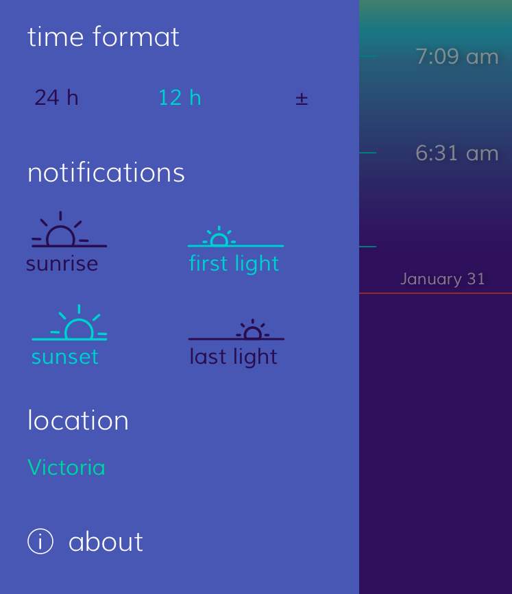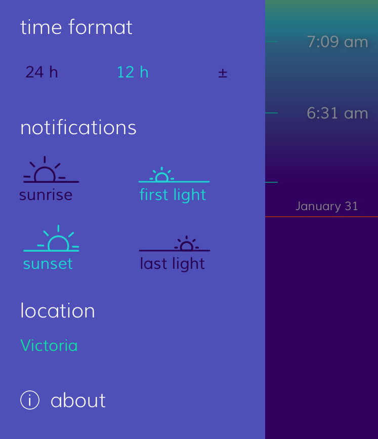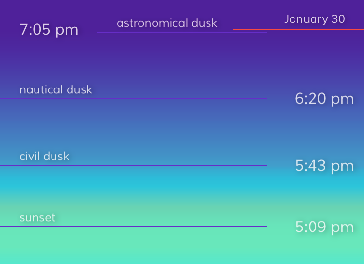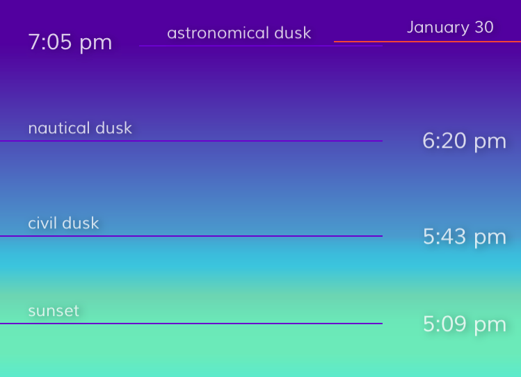 π Hey guys! Solis is a little app I made to ease the frustration of never knowing when it gets dark. In the summer I can be walking around in daylight at 10pm, but in the winter months it's already dark when I'm driving home from work. The sun is very predictable and it seemed like a useful problem to solve.