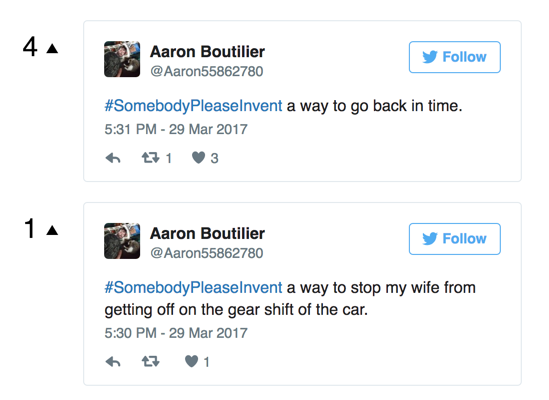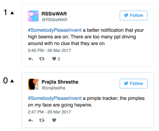 About an hour ago I saw the hashtag #SomebodyPleaseInvent trending on Twitter. I'm not sure how it got started, but people are using it to tweet ideas of products they'd like to exist. Very similar to how #RequestForStartup or #RequestForProduct is being used in the tech community.