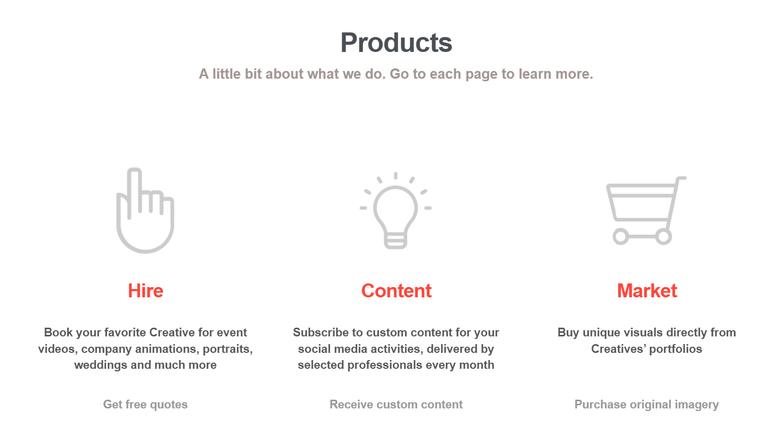 In a nutshell we're a marketplace connecting clients with creative freelancers: Animators, Photographers, Videographers, Illustrators and Designers!