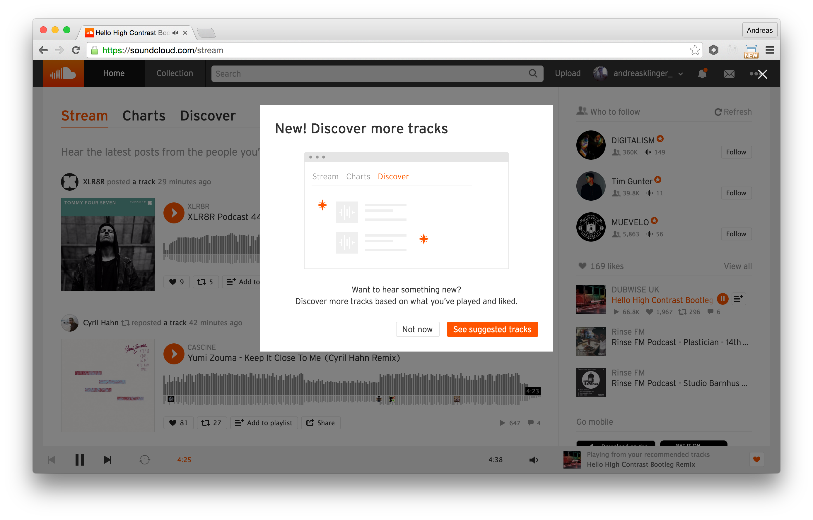 I'm a daily SoundCloud user, but discovery had been weak. Most of my discovery was through Hypem. I'd like to see a shuffle option to shuffle through all suggestions, rather than just playing all songs similar to X.