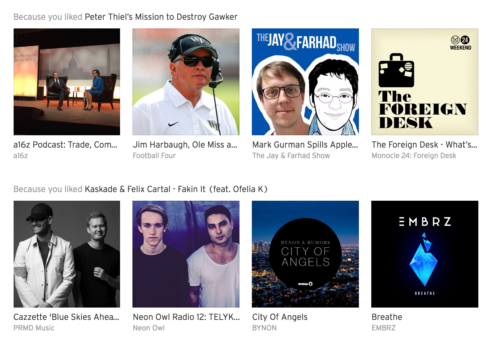 Love this. I'm a huge SoundCloud fan but discovery is tough unless you spend a lot of time curating your feed following the right artists/people. This feels a lot like Netflix's recommendations (e.g. "Because you liked Mr FijiWiji, Direct, & Aruna").