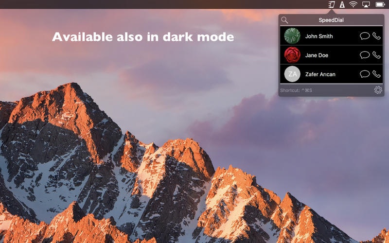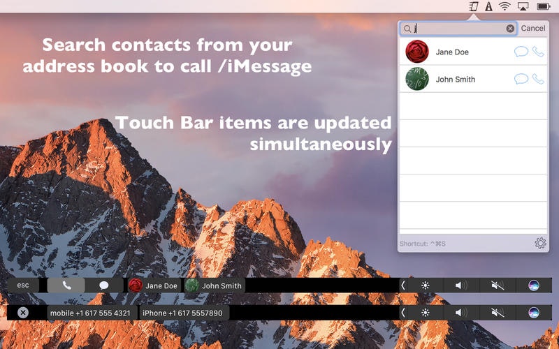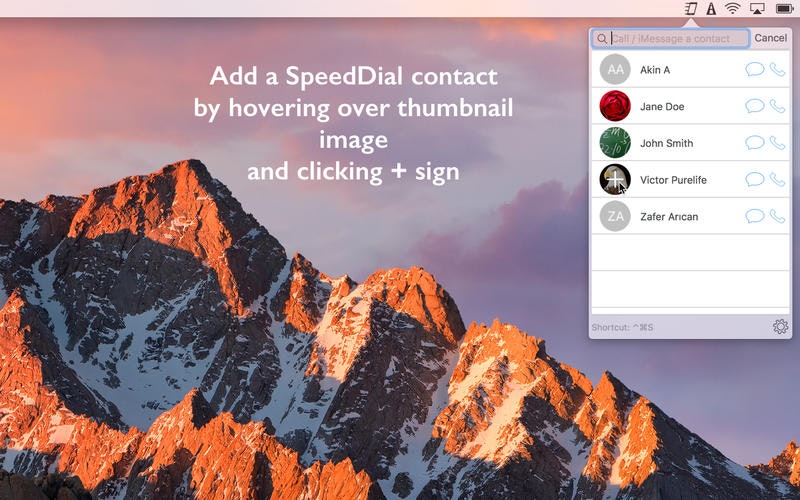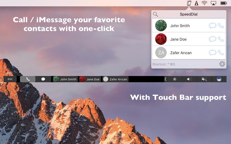 SpeedDial lets you call your favorite contacts and send iMessage / SMS messages to them from your Mac. Features: * Call your favorite contacts with one click * Send iMessage / SMS to your favorite contacts with one click * Call or send iMessage to any number or a contact in your addressbook * Your contacts are on Touch Bar.