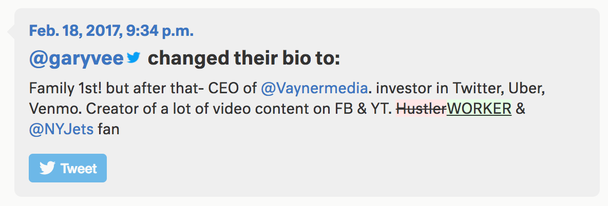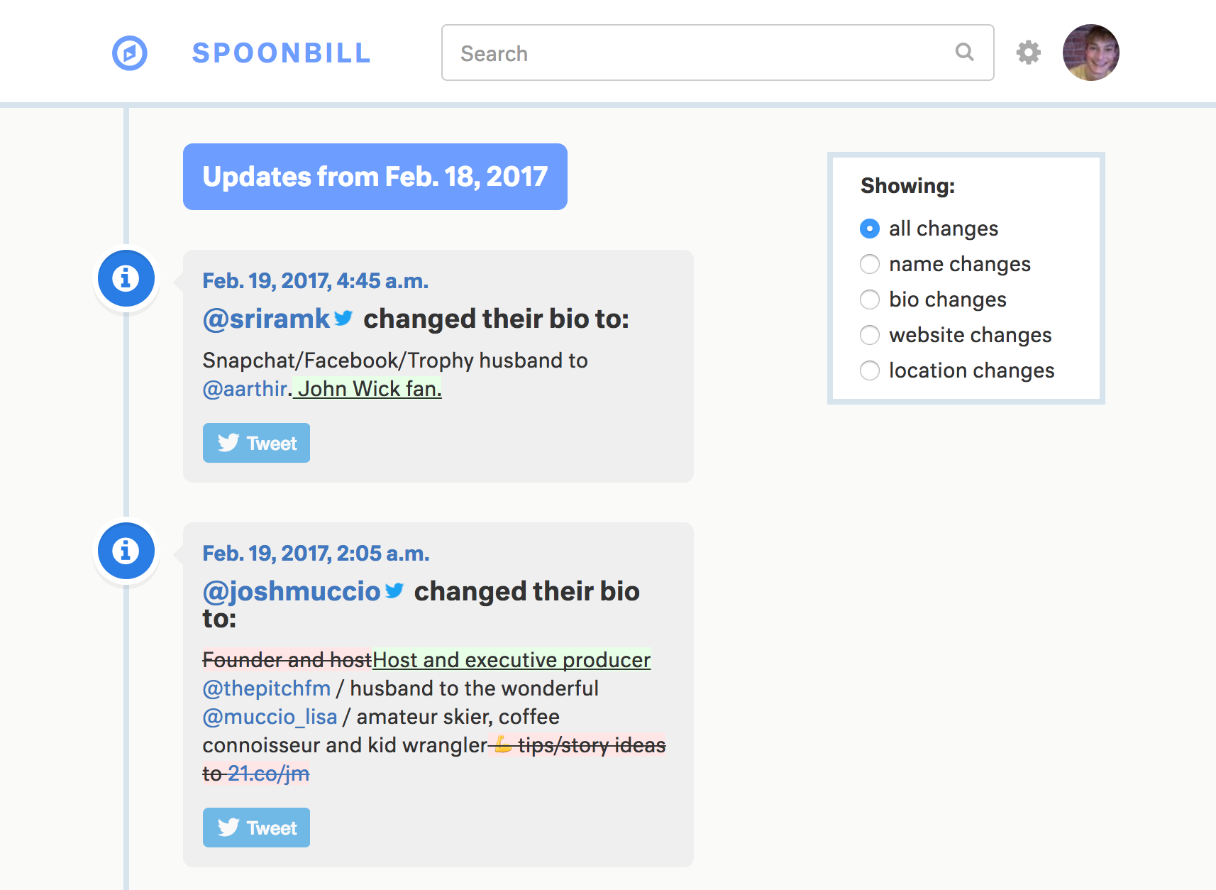 I subscribed to Spoonbill a few weeks ago and enjoy the weekly digest of my Twitter friends' bio changes. It's interesting to see how people change the way they describe themselves. It's also a particularly handy tool for journalists.