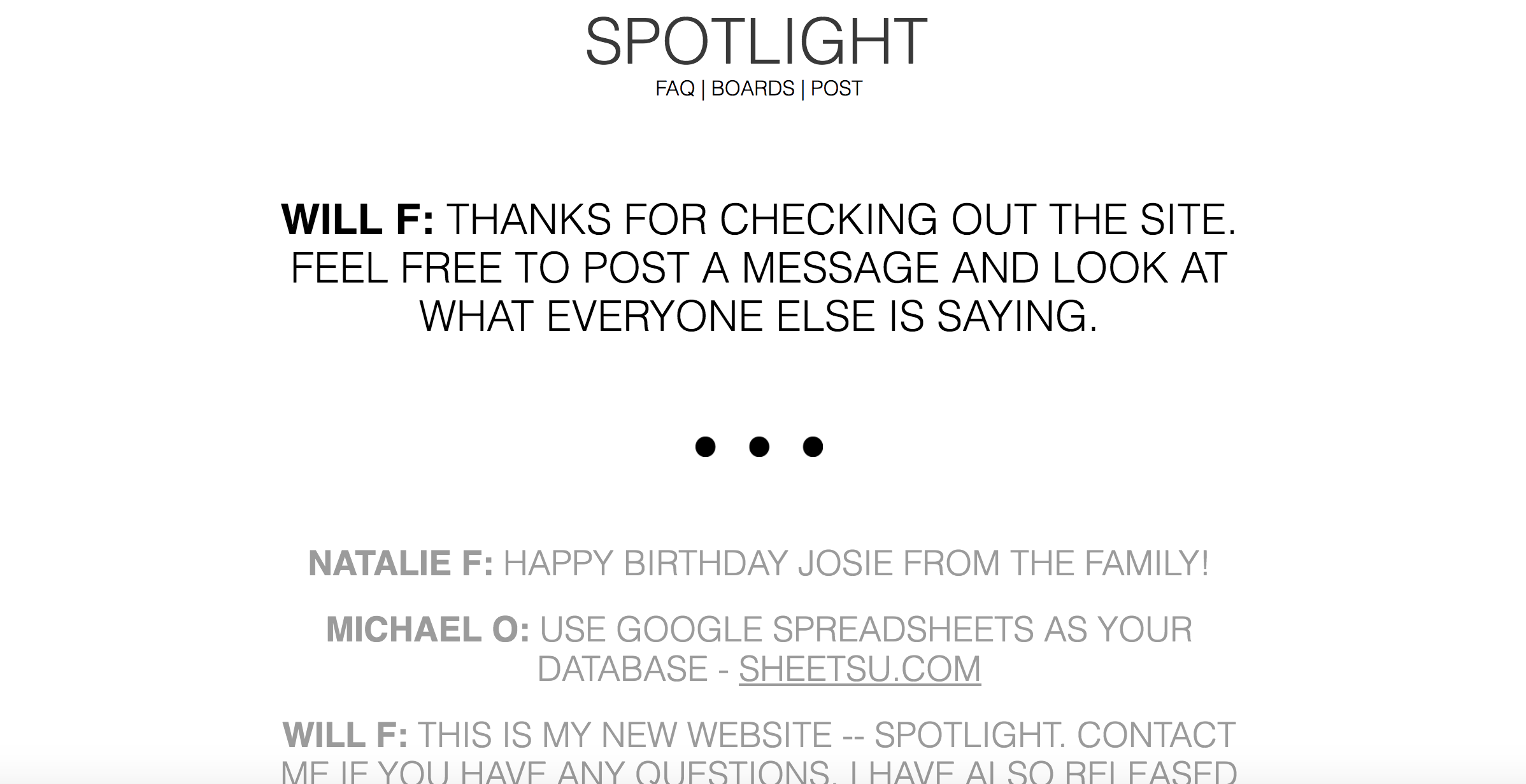 Today, I released Spotlight: A new kind of online message board. When you post a message on Spotlight, it will stay on the homepage forever. Messages can promote products/businesses, give shoutouts to friends/family, or say whatever else you want to say. The newest message stays ‘in the light’ and the older messages are shown below in chronological order. Ea… See more