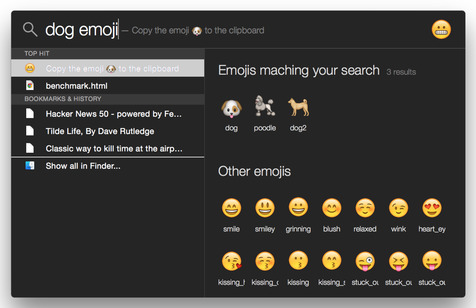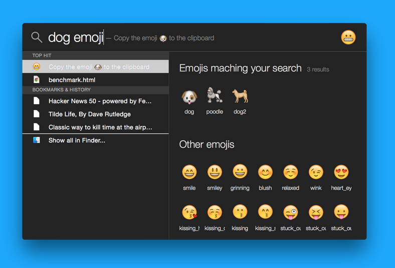 Back in November, I posted Flashlight, a plugin system for Spotlight. Product Hunt liked it. Now there are a ton of plugins, and this is one of the coolest. Mark Bachman wrote a plugin to search emoji from spotlight — it's probably the fastest way to type emoji on a Mac today.