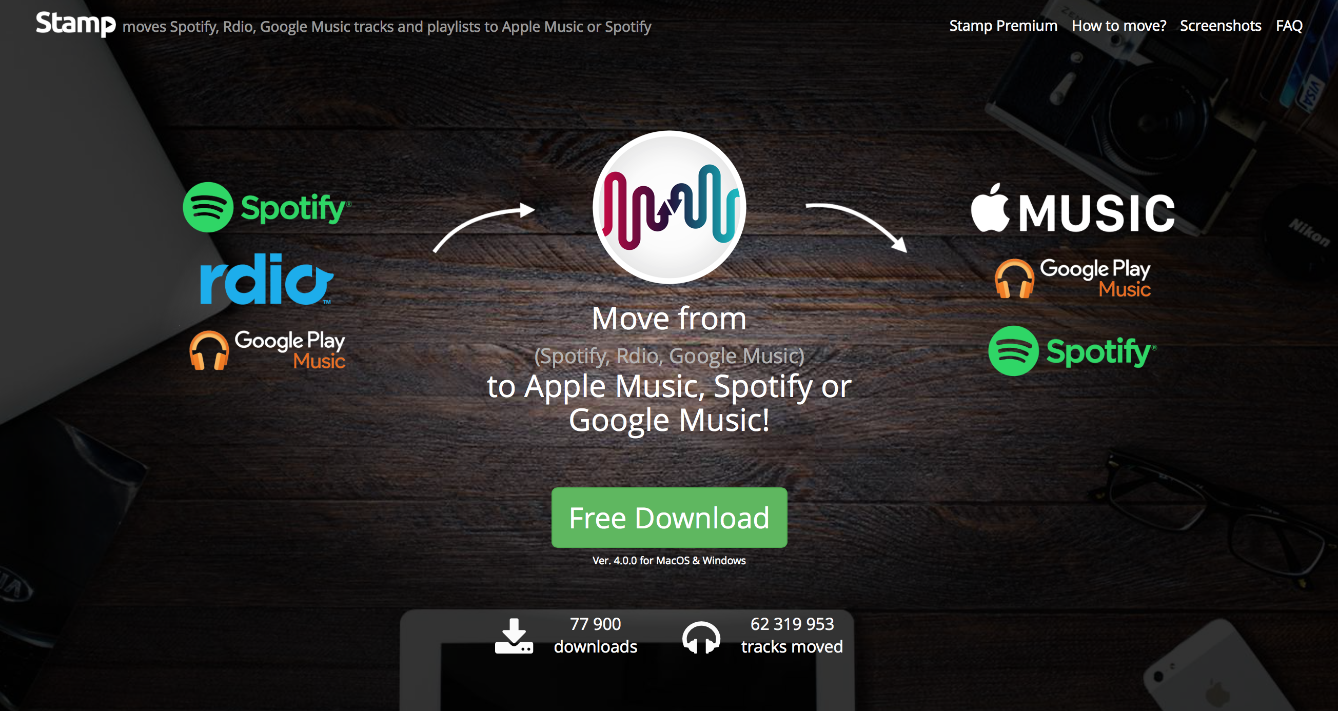 So originally named S.t.A.M.P. (from "Spotify to Apple Music Playlists") has expanded to help everyone leaving Rdio to protect their precious collections. Also Stamp now transfers your Google Music songs to Apple Music 😽.