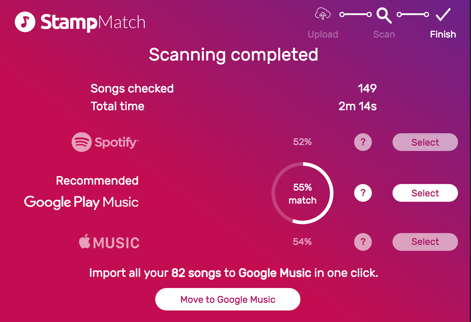 Stamp Match is a FREE app that checks which music streaming provider (Spotify, Google Play Music, Apple Music) has most of your mp3 files.