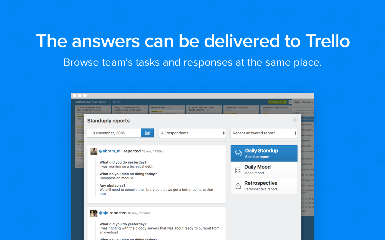 Standuply is a bot that runs daily standup meetings in Slack and delivers the results to Trello (and to Slack as well).