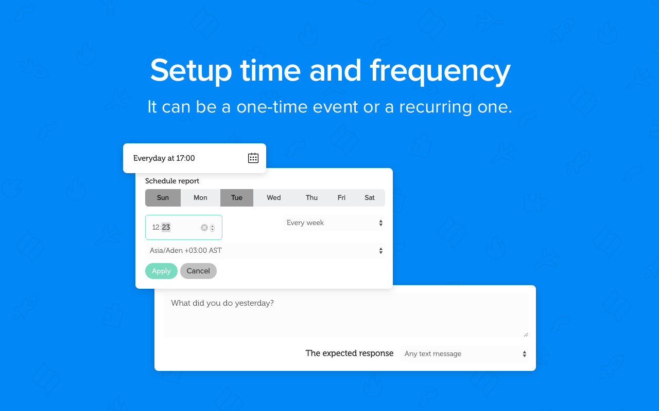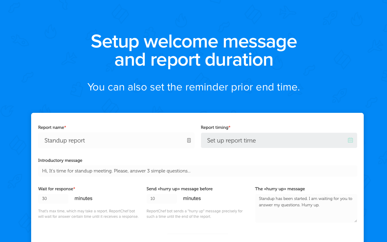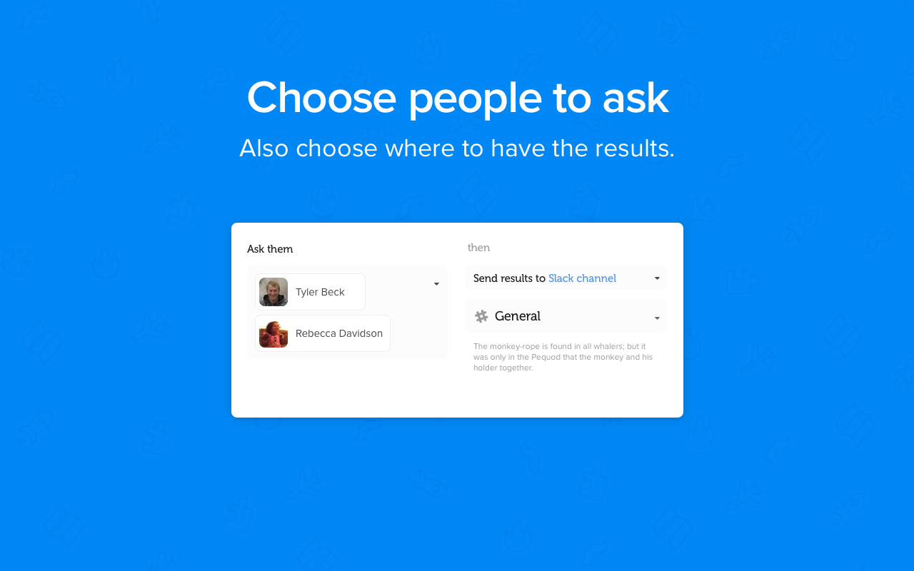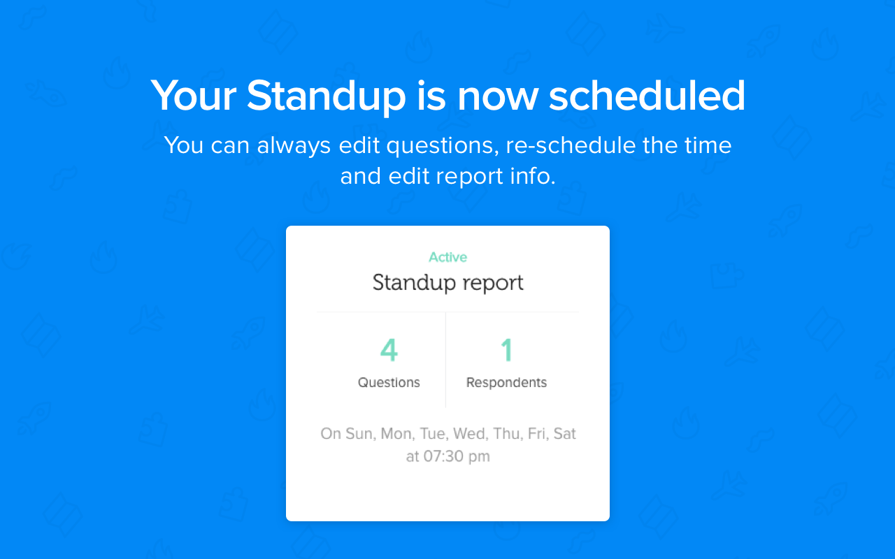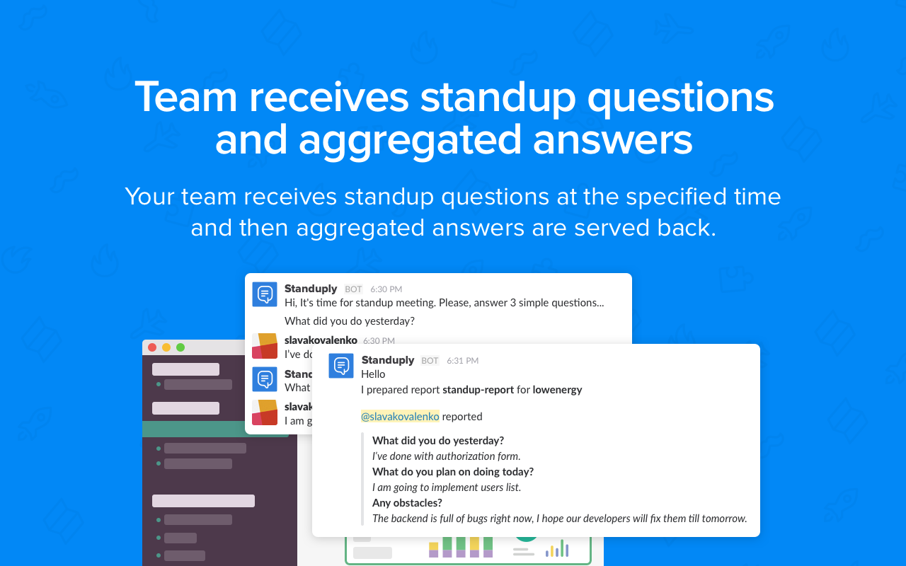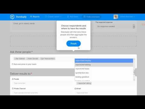 You set up questions, choose people to ask and pick a schedule. Then Standuply interviews team members by asking the questions, aggregates answers and delivers the results where you need them.