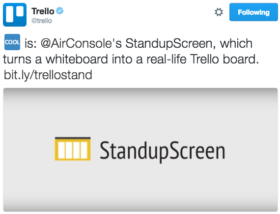 We've been using this for a while now at AirConsole and today we decided to make StandupScreen available for everybody. Standupscreen.com is a free tool that lets you turn any whiteboard into an interactive Trello board using computer vision. We always wanted a dynamic tool that would enable us to interact with our Trello cards during our daily standu… See more