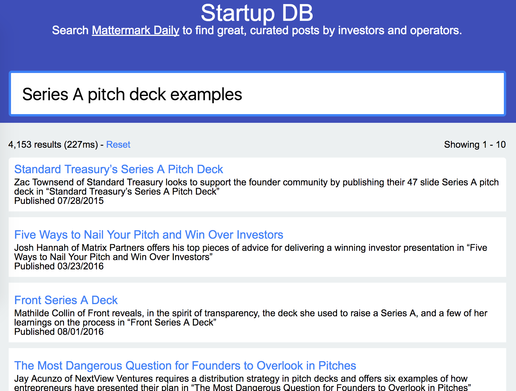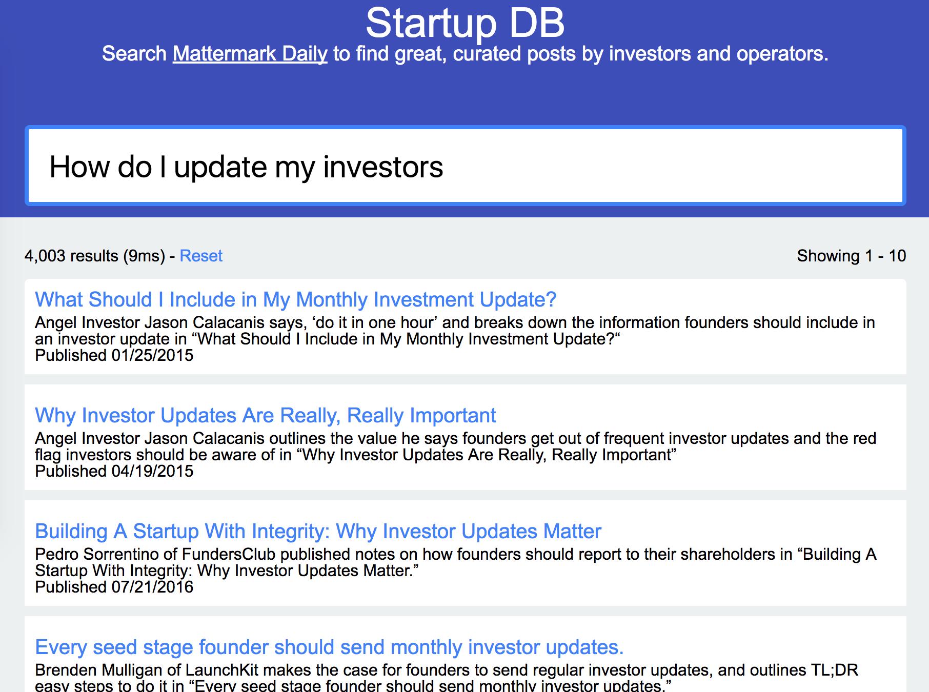 The Mattermark Daily is a daily newsletter I curate that features first-hand perspectives on entrepreneurship, investing, sales, hiring, and more, as it emerges everyday. As a weekend hack, Isaac Madan deep-indexed every article featured in the Daily over the past few years, and built StartupDB: a simple search interface so you can find the best, most releva… See more