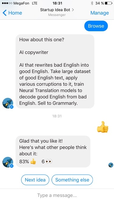 Hey guys! Thanks for trying out our bot. Soon we'll add options to connect with the authors of ideas you liked. We think this would be a nice way to find a co-founder, join a cool project or maybe even attract investments!