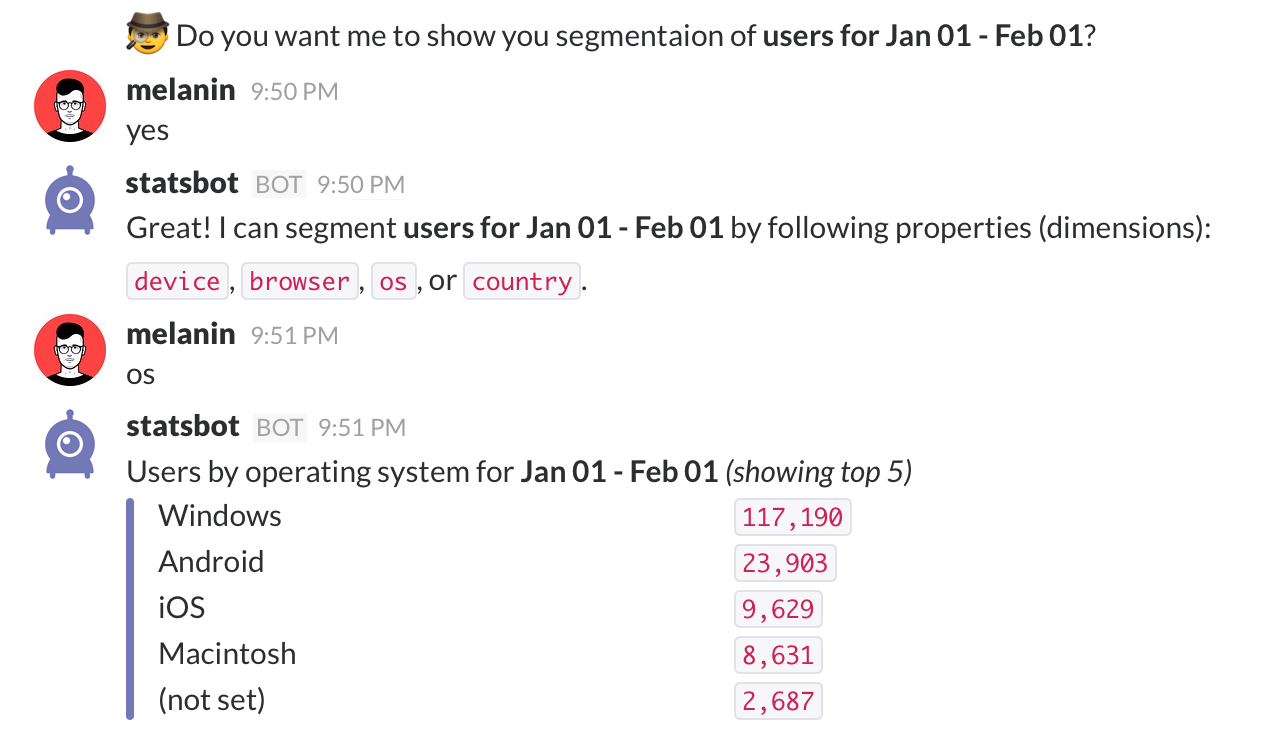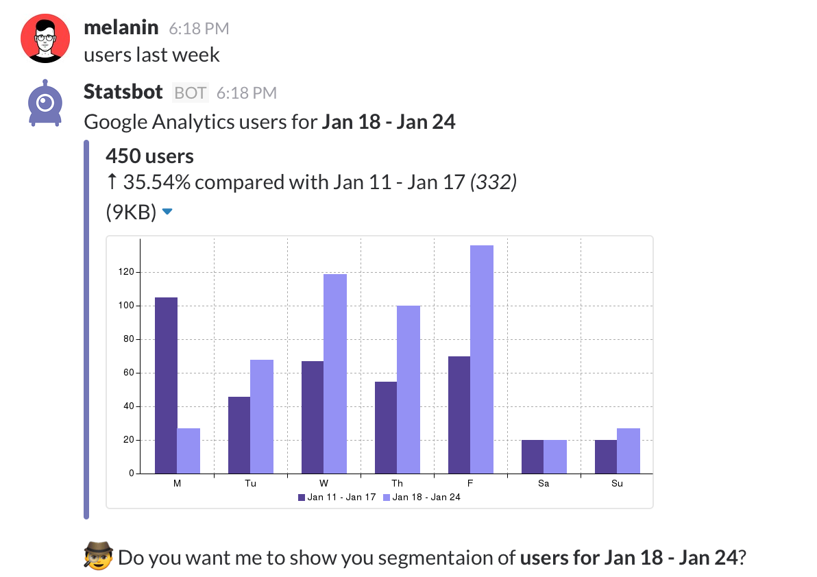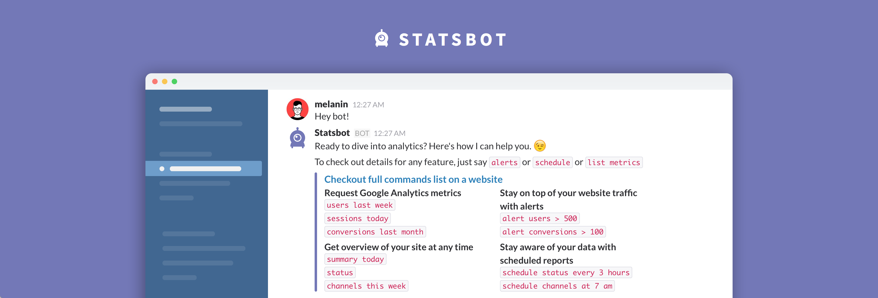 Statsbot is designed for product teams who need to constantly stay aware of analytics data but are overwhelmed by the complexity of existing tools. Statsbot solves this issue by providing you and your team with analytics insights in the most natural way - just ask him, like your buddy.