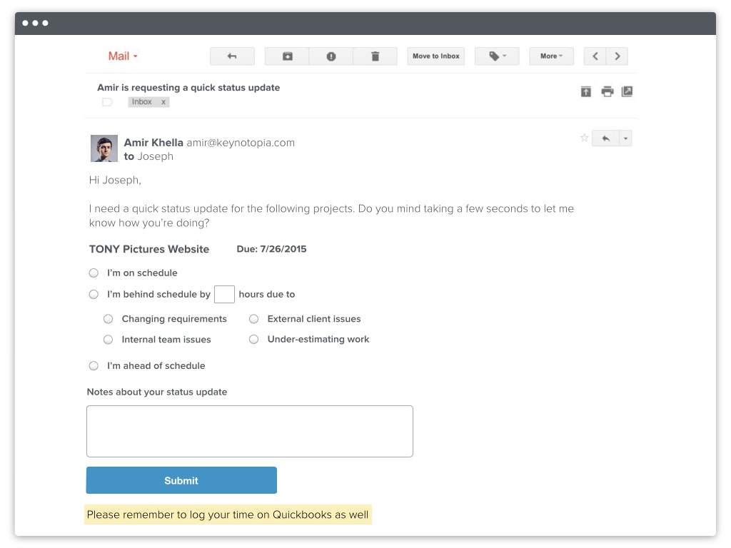 Would love to see some integrations with the tools we're using to actually manage the projects, like Basecamp, Asana, etc.