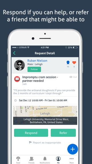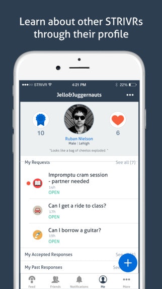 Strivr launched in the App Store a year and a half ago. We wanted to create a platform that let people ask for help more easily. So many people don't ask for help because they feel guilty, don't want to put someone on the spot, or don't even know who or how to ask. Strivr was created to solve this problem, an… See more