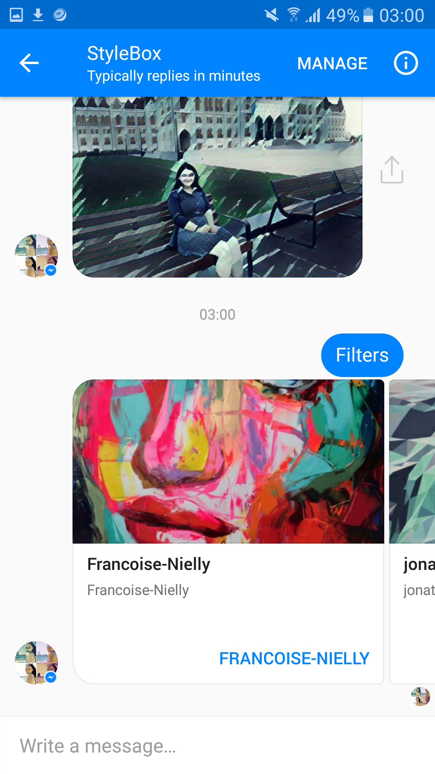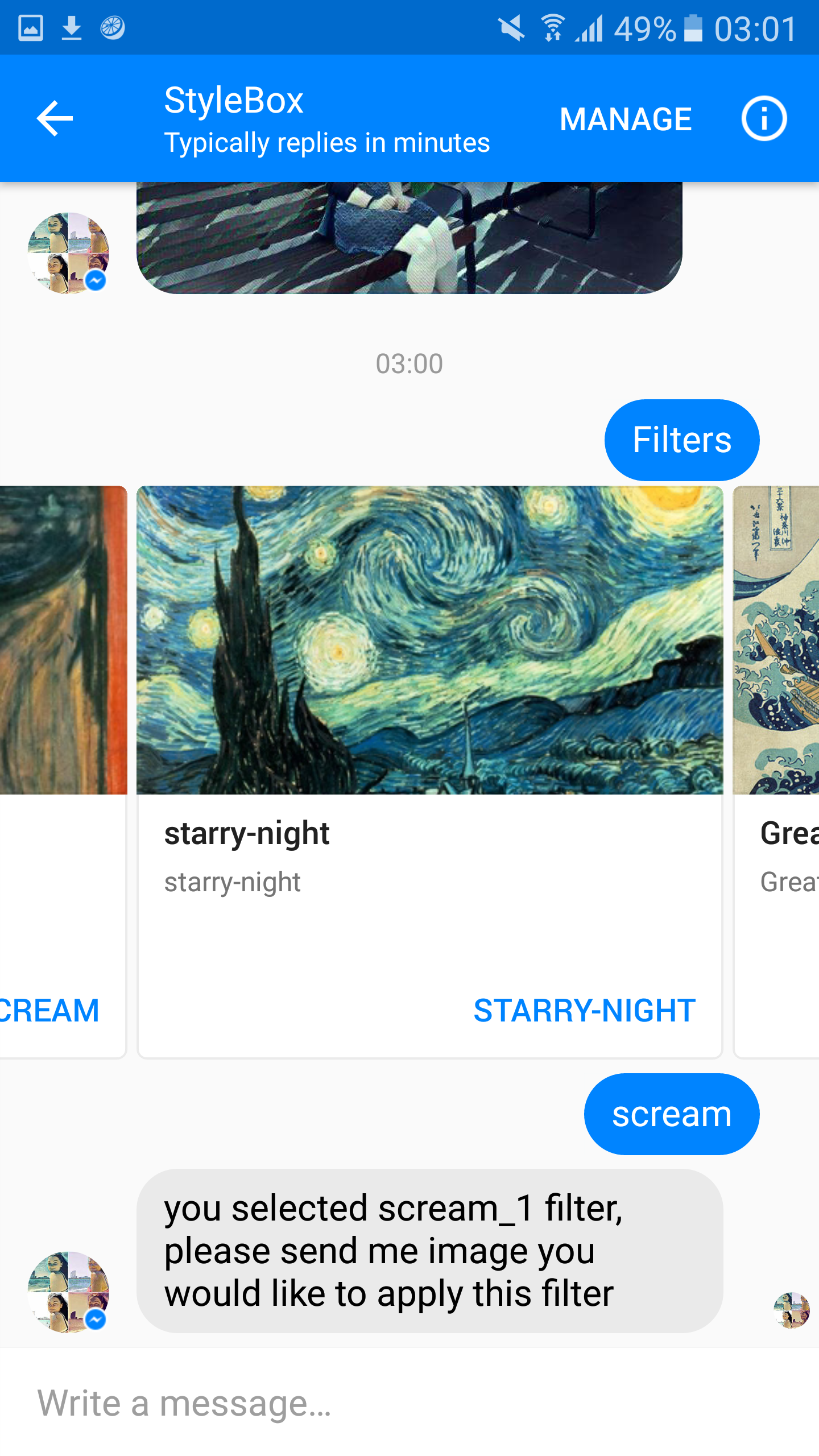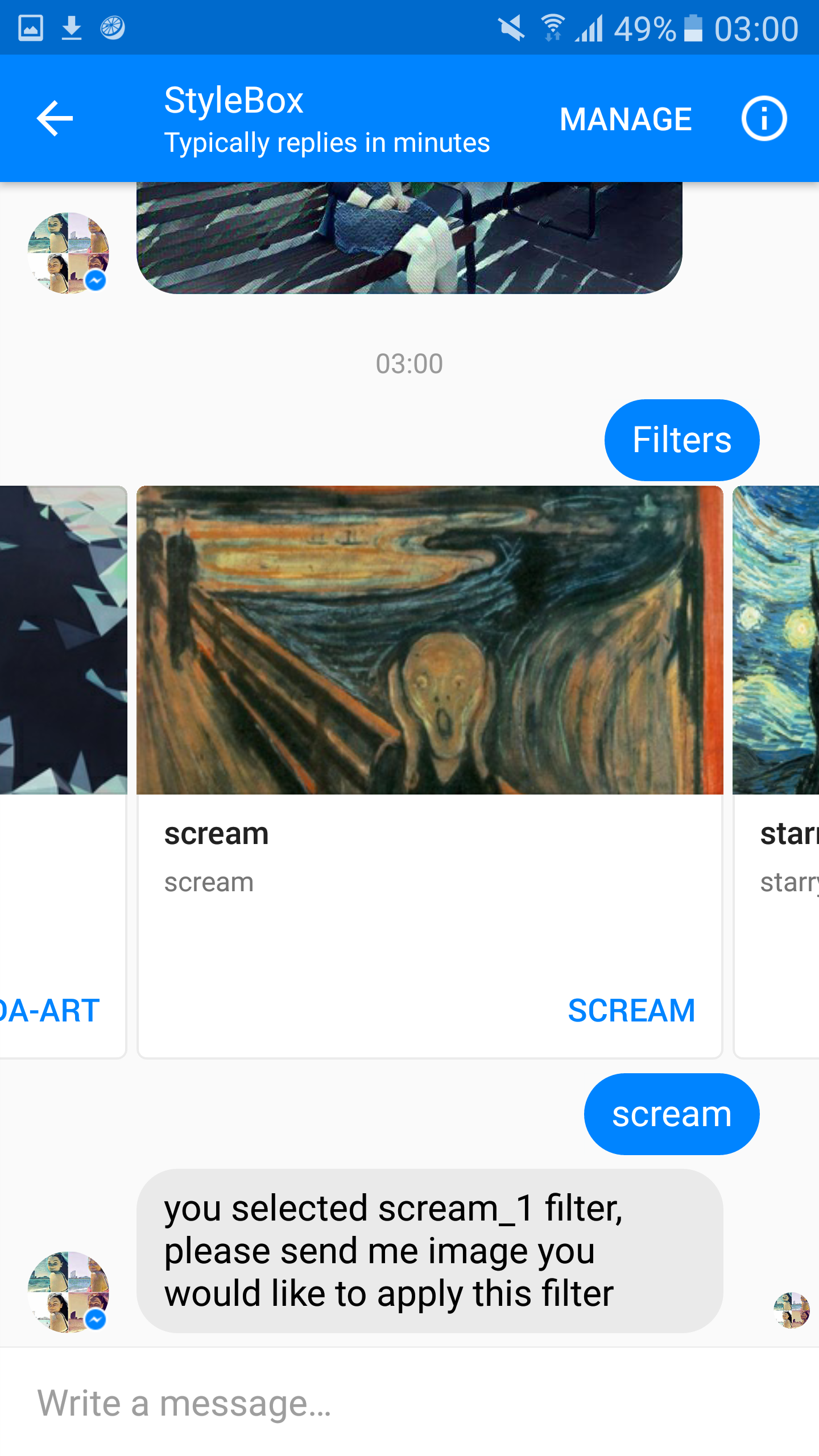Stylebox is a bot for fb messenger which detects style of famous paintings and applies that style to your photos.