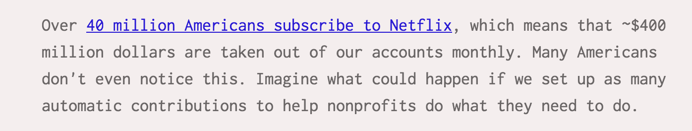 You don't miss that $10 a month that goes to Netflix, right? Time to put $10 a month towards a good cause. I love this idea, hopefully it starts a trend.