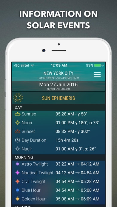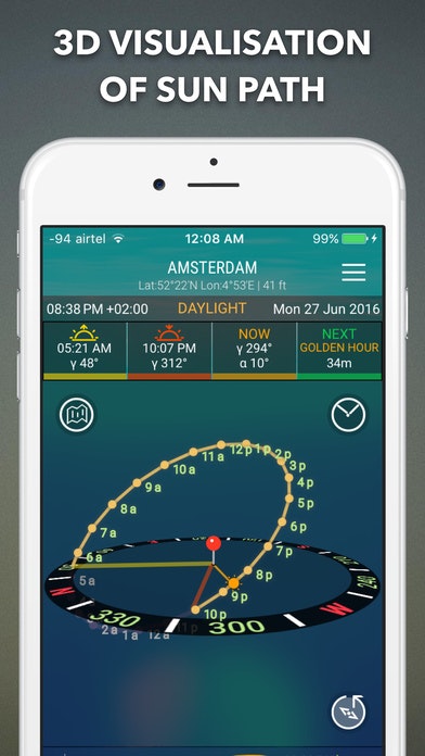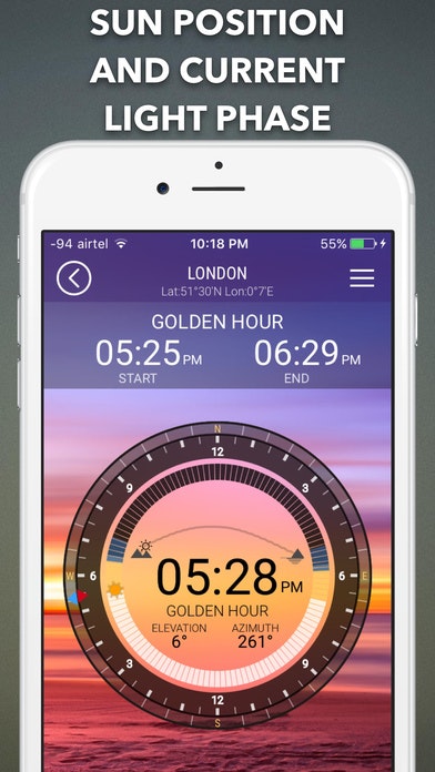 SunIZup helps you to know the timings of the various Sunlight phases including the Golden Hour and Blue Hour (also known as Magic Hour by photographers and cinematographers) for any selected location and any given date. The timings are calculated in the app by determining the sun's position and path at the given location on the given date. It is a proven fac… See more