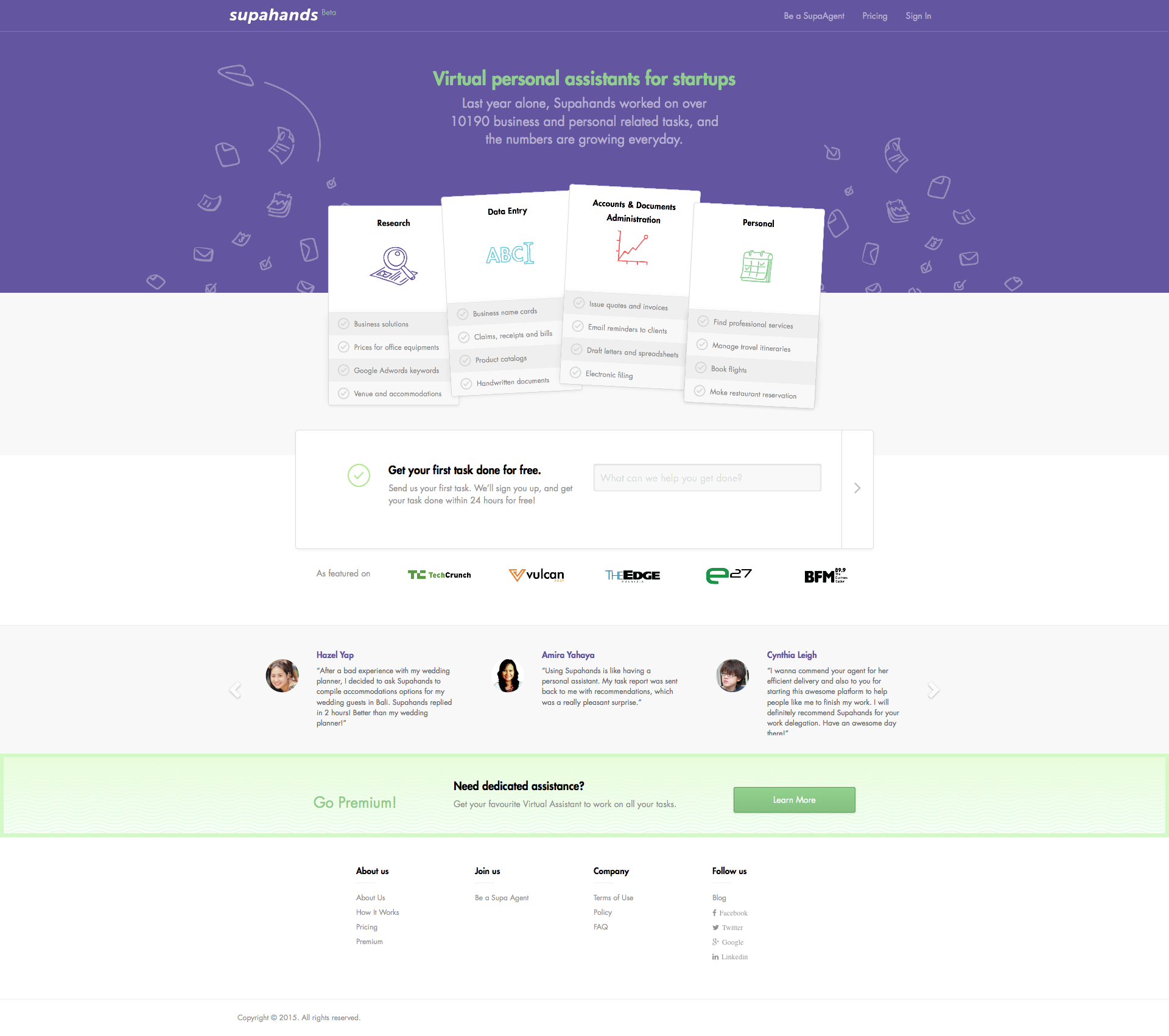 Powered by an army of curated SupaAgents (virtual personal assistants), Supahands (still in beta) is a service that helps entrepreneurs, tech startup teams and professionals offload their to-do list so that they can spend their time in a more meaningful way. All the things you wished someone else would give you a helping hand for — pesky phone calls, preliminary market research for your startup, travel research and itinerary planning, proofreading, transcription, data entry — your SupaAgent will take pride in getting things done for you with a smile.