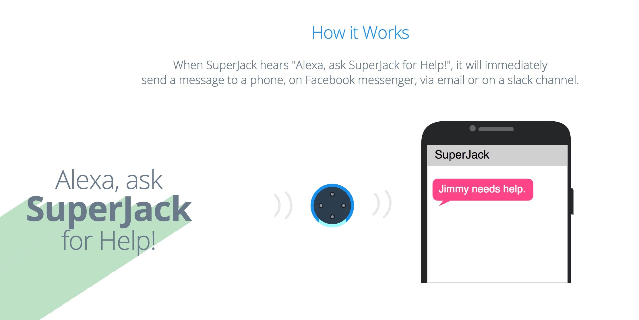1) If SuperJack hears "Alexa, ask Superjack for help" it sends a custom message via SMS, email, Facebook message, or Slack. (Provides babysitters, tenants, etc an easy way to get in touch with you.)