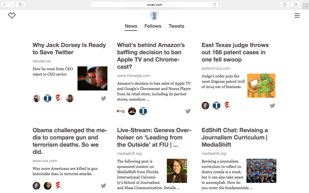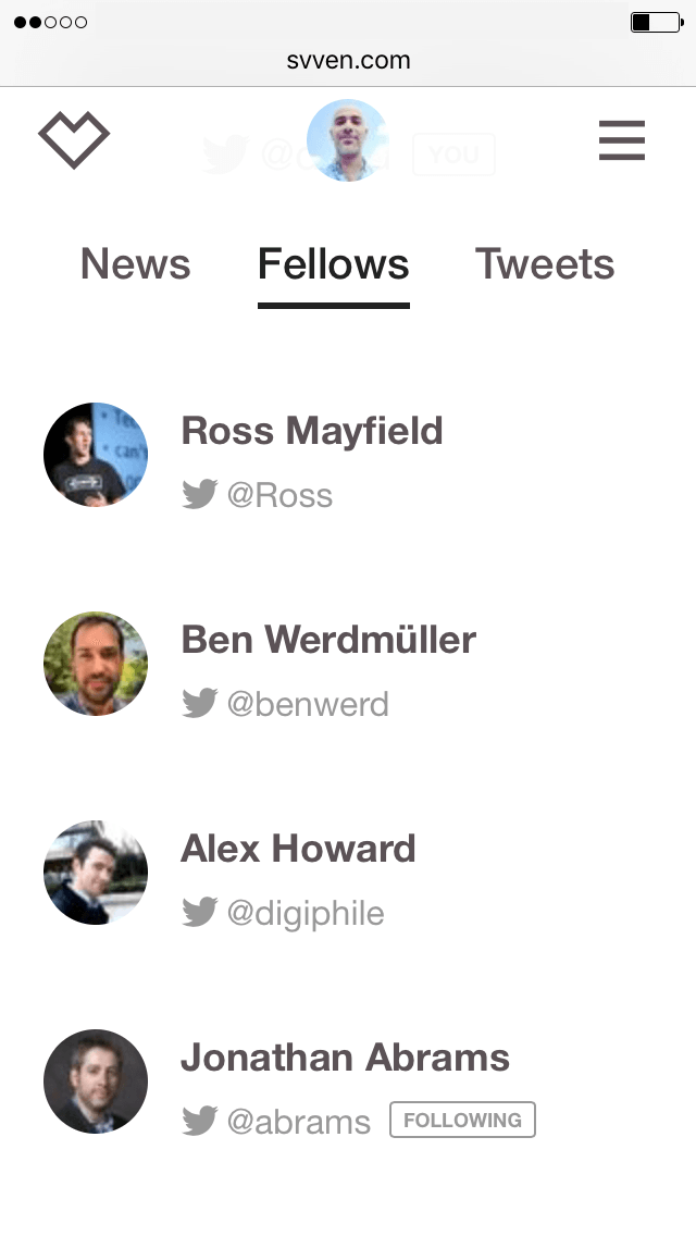 A little rough around the edges yet, Sven is the kind of tweep-discovery tool that could help "save twitter" (if you believe twitter needs saving, a long conversation for another forum). It makes so much sense to correlate the content that you actually share to tweeps you could meet. The point isn't to find more content, like Nuzzel. The point is to find in… See more