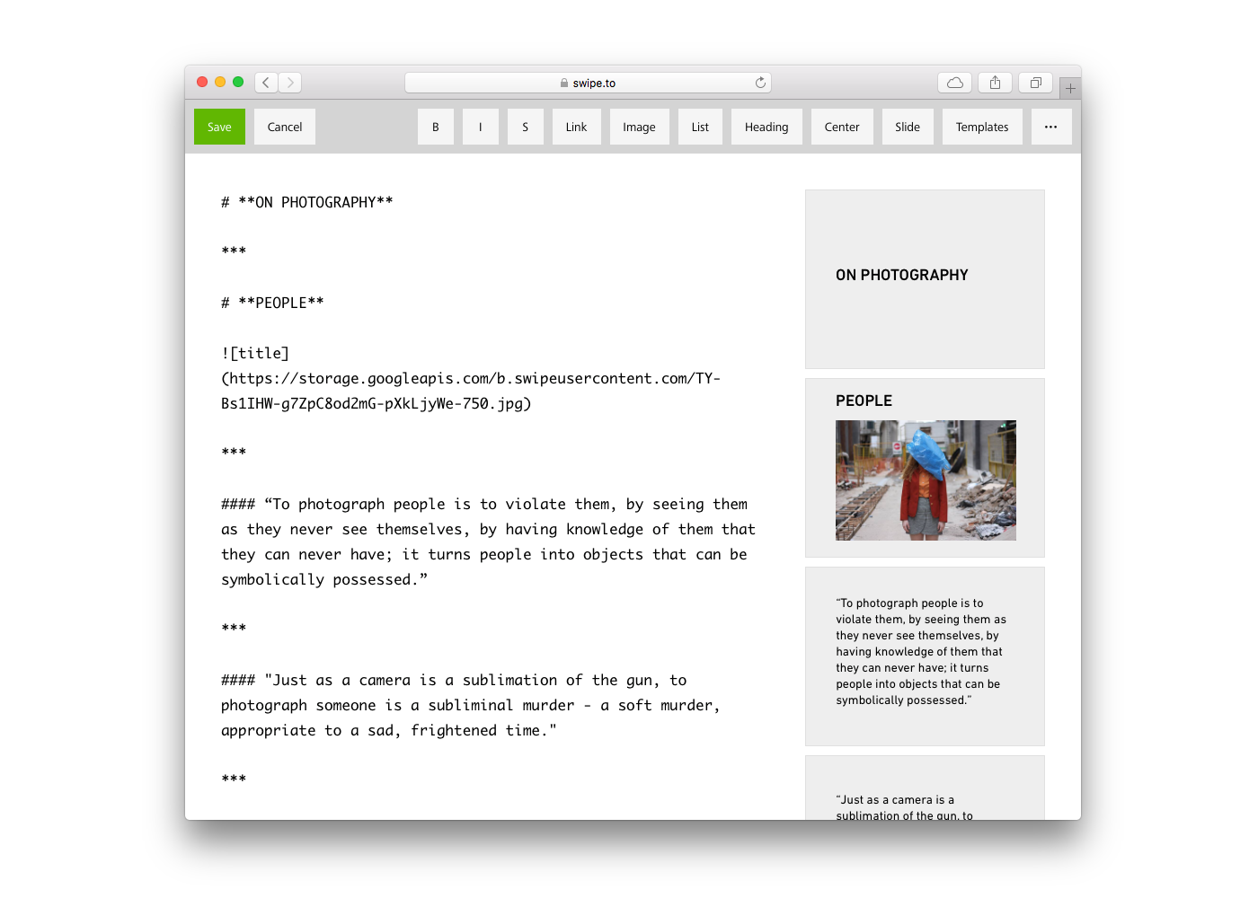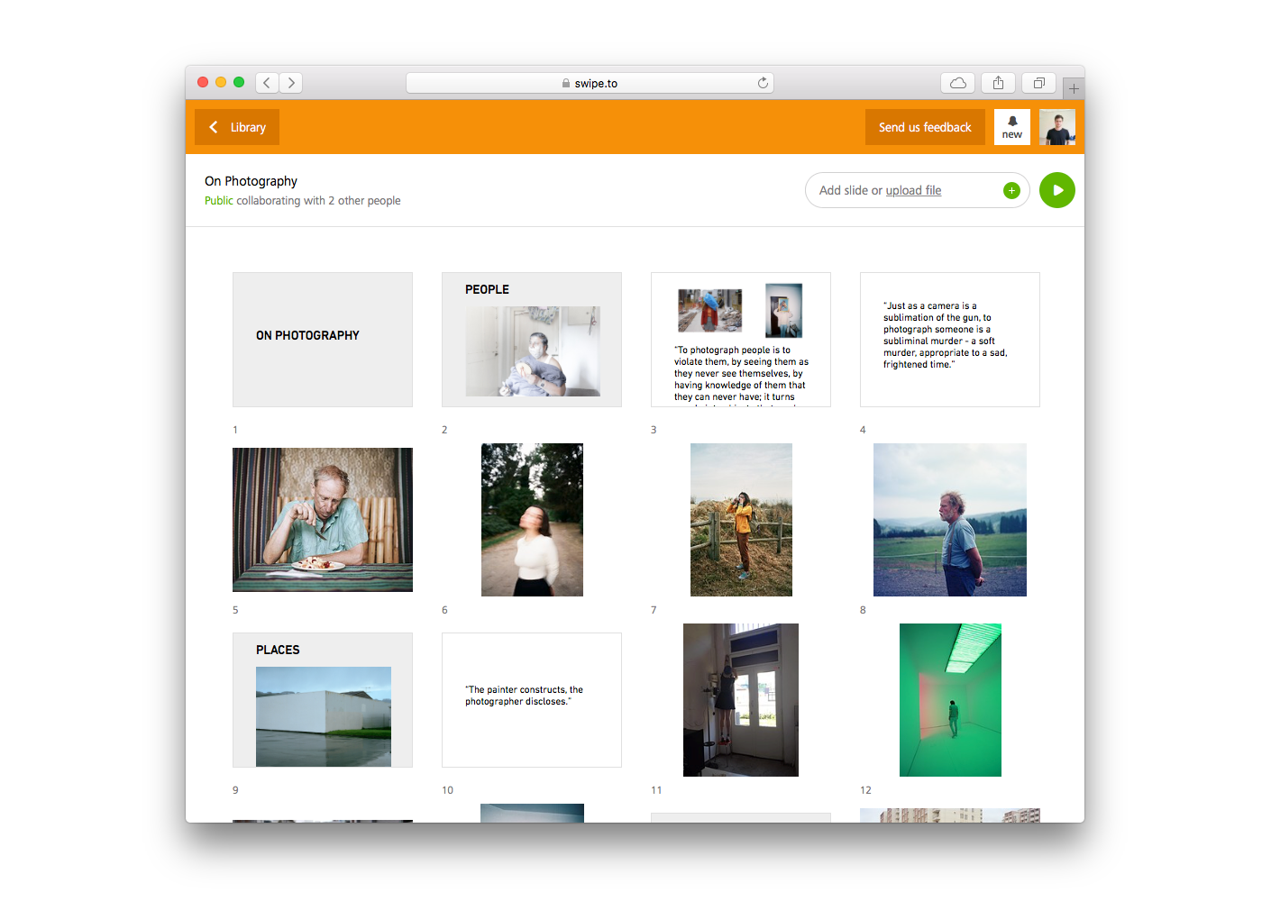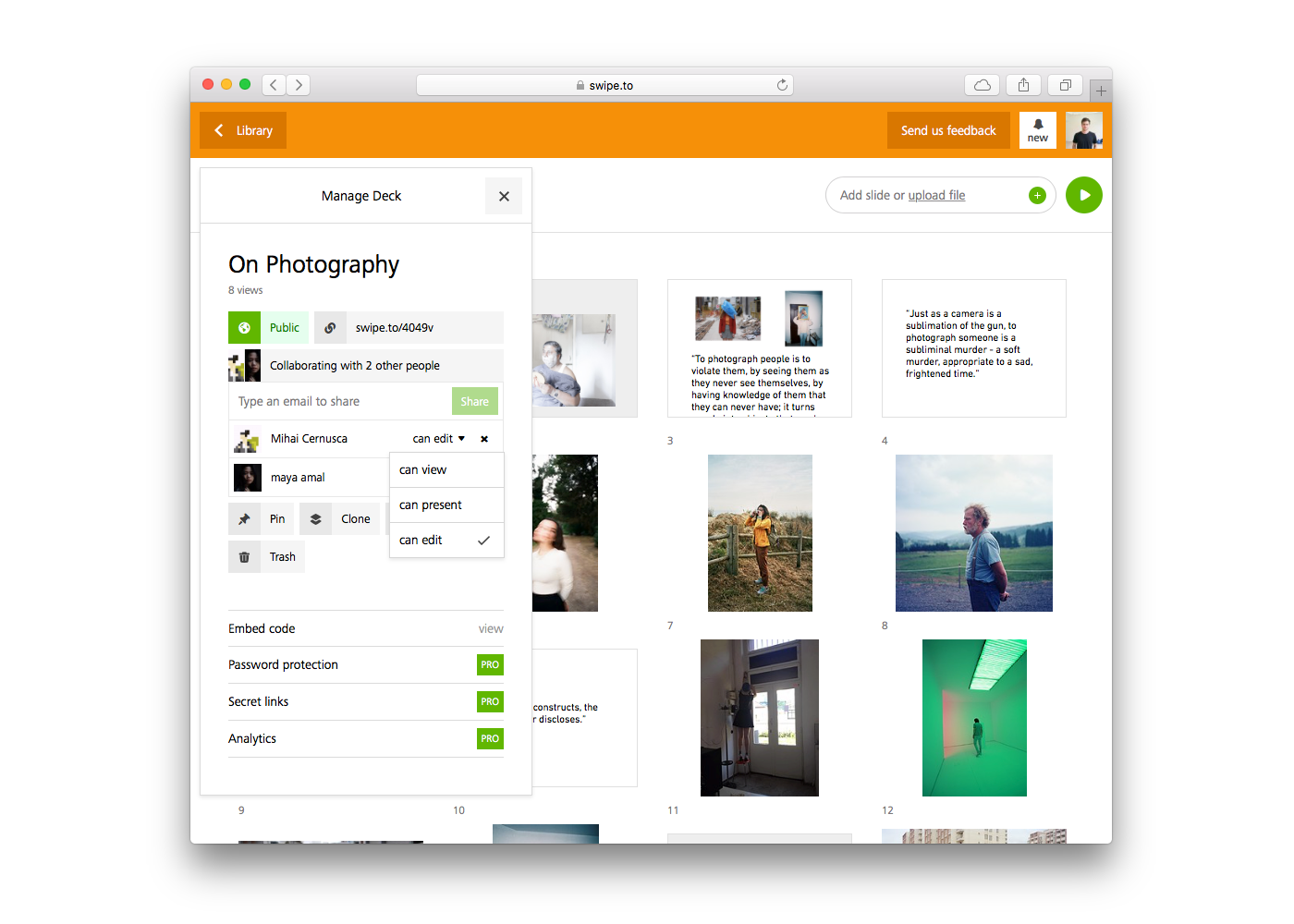 Swipe is the best way to present to anyone, anywhere, on any device and the simplest way to create a beautiful responsive presentations in minutes. It all works in the browser, on your phone, tablet, or computer. We've completely rebuilt the whole a… See more