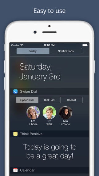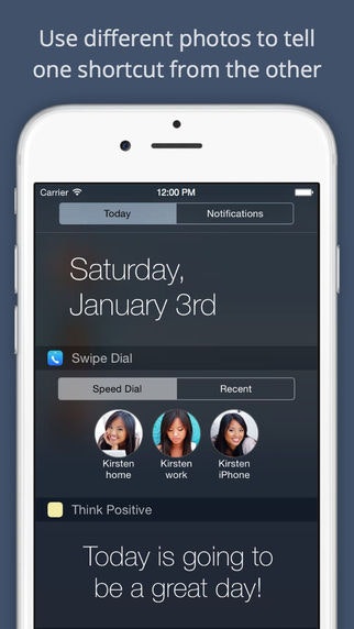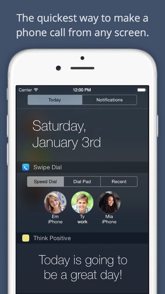 Swipe Dial lets you put your favorite people right in your Today screen as a widget. All you have to do is swipe down and tap the person you want to call or text.
