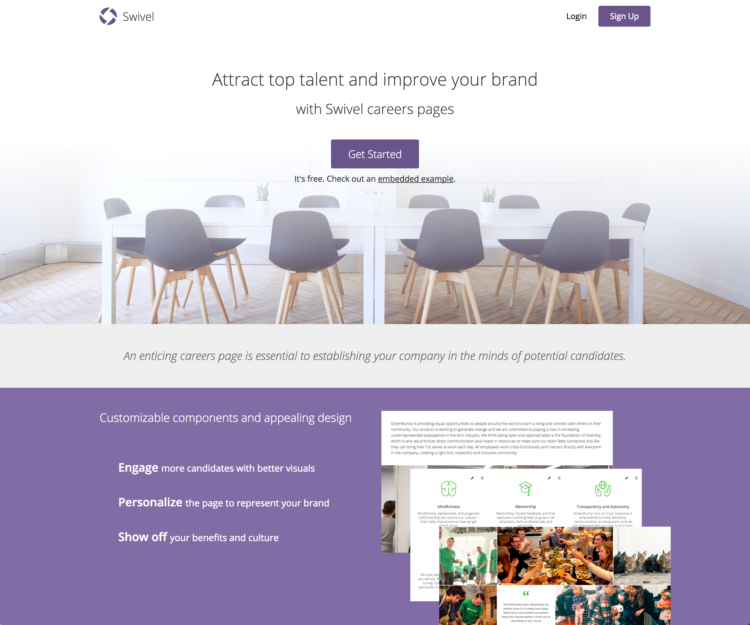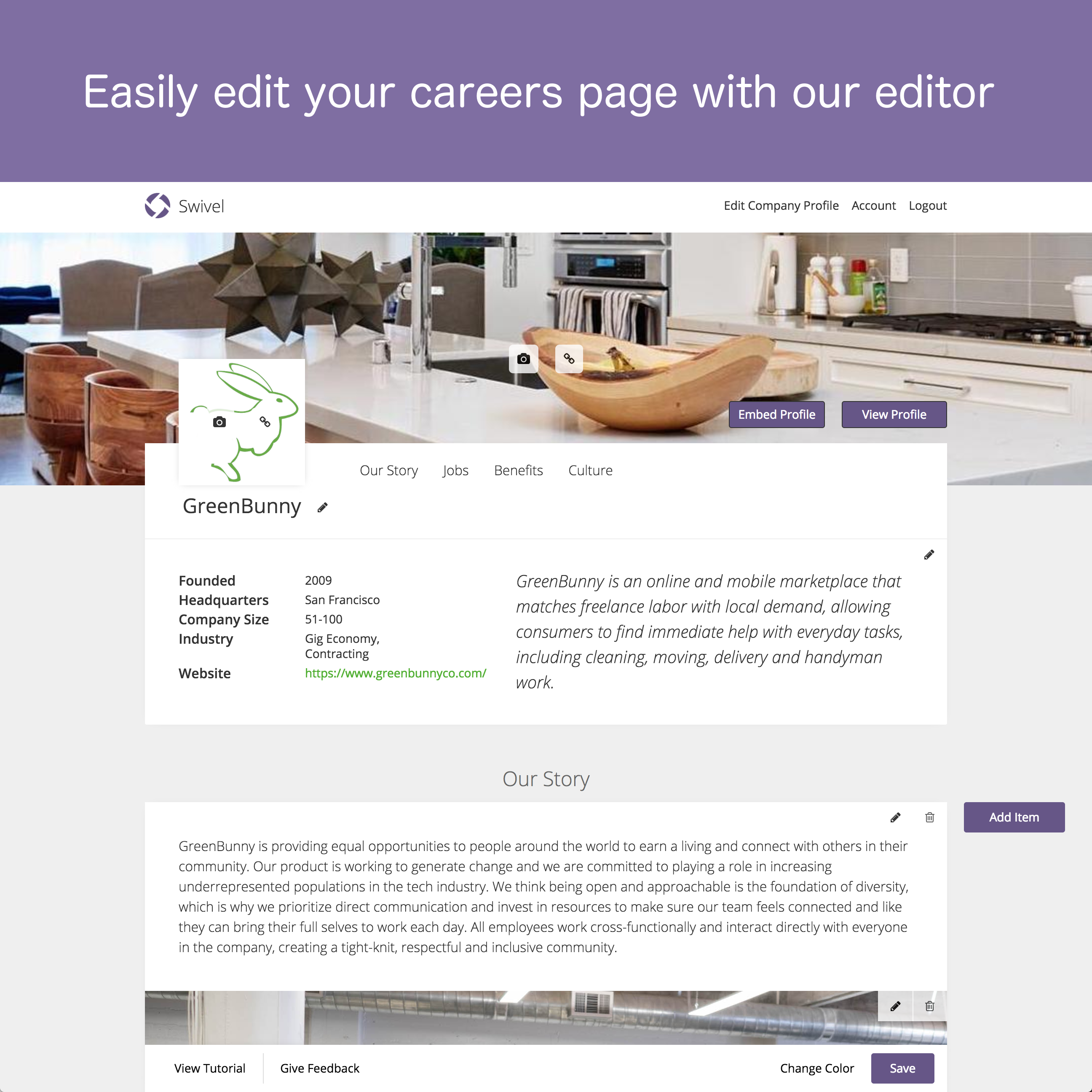 We noticed that some companies don’t have the time or resources to create an appealing careers page, but it’s the first point of contact for most job seekers. We made Swivel so companies can quickly create and embed a careers page right into their website and provide an appealing brand to prospective employees.